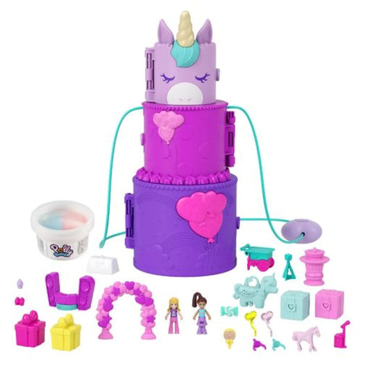 Mattel Polly Pocket Ausklappspaß-Schatulle Einhorn-Torte, niedliches Design, 25 Zubehörteile