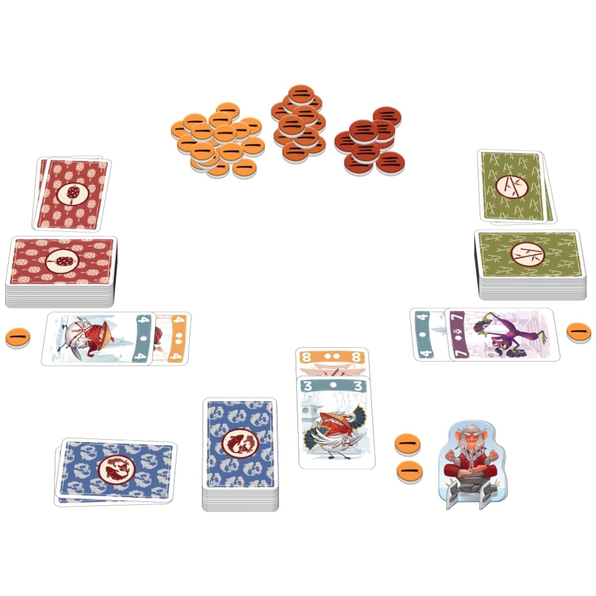 Alle erhalten ein Deck mit 24 Karten, bestehend aus Karten mit den Werten von 1-8 in drei verschiedenen Farben. Davon nehmen alle jeweils 4 Karten auf die Hand, die restlichen dienen als persönlicher Nachziehstapel. Reihum legen die Spielenden nun 2 Karten vor sich aus und prüfen im Anschluss, wer in welcher Farbe den höchsten Wert ausgespielt hat. Je nach Farbe und Durchgang erhält man hierfür unterschiedlich viele Minuspunkte. Im ersten Durchgang werden Chips mit einem Minuspunkt, im zweiten mit zwei Minuspunkten und im dritten mit drei Minuspunkten verteilt.