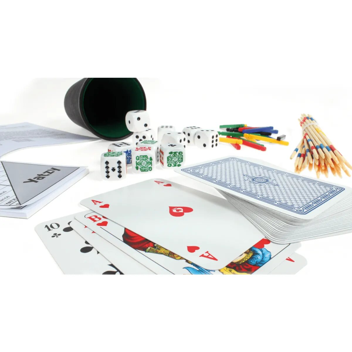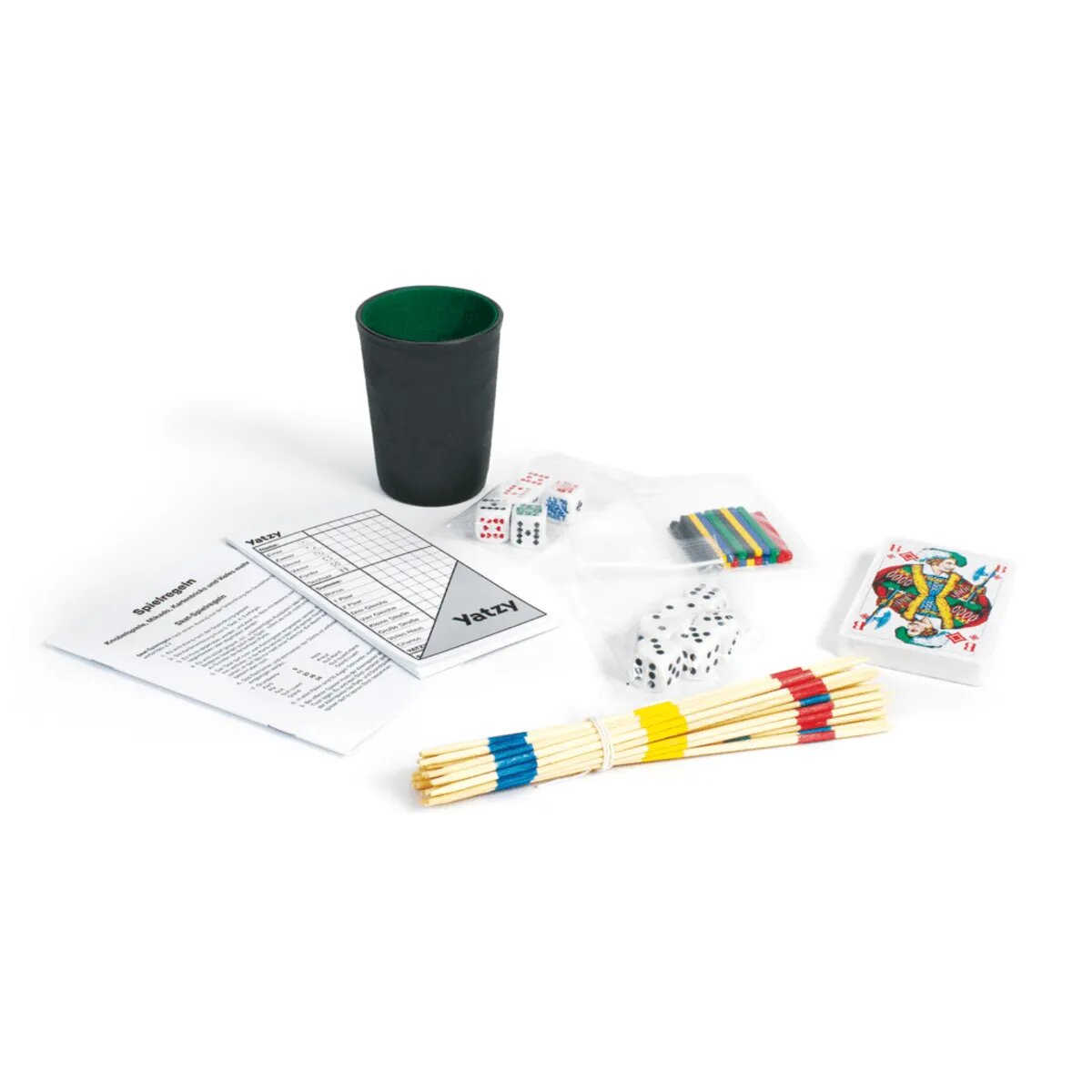 Man nehme: Einen Würfelbecher mit 6 Würfeln, ein Skatspiel sowie einen Yatzy-Block, verpacke alles in einem stabilen und praktischen Stülpkarton und fertig ist die Grundausstattung für 999 Stunden Spielevergnügen. Ganz egal ob gemütlich zu Hause, beim Treff mit Freunden oder spontan unterwegs beim Picknick - in der praktischen Spielebox sind immer die wichtigsten Dinge zum Spielen mit dabei. Eine ausführliche Beschreibung verschiedener Würfel- und Kartenspiele komplettieren das Allround-Spieleset und der Spielspaß kann beginnen!