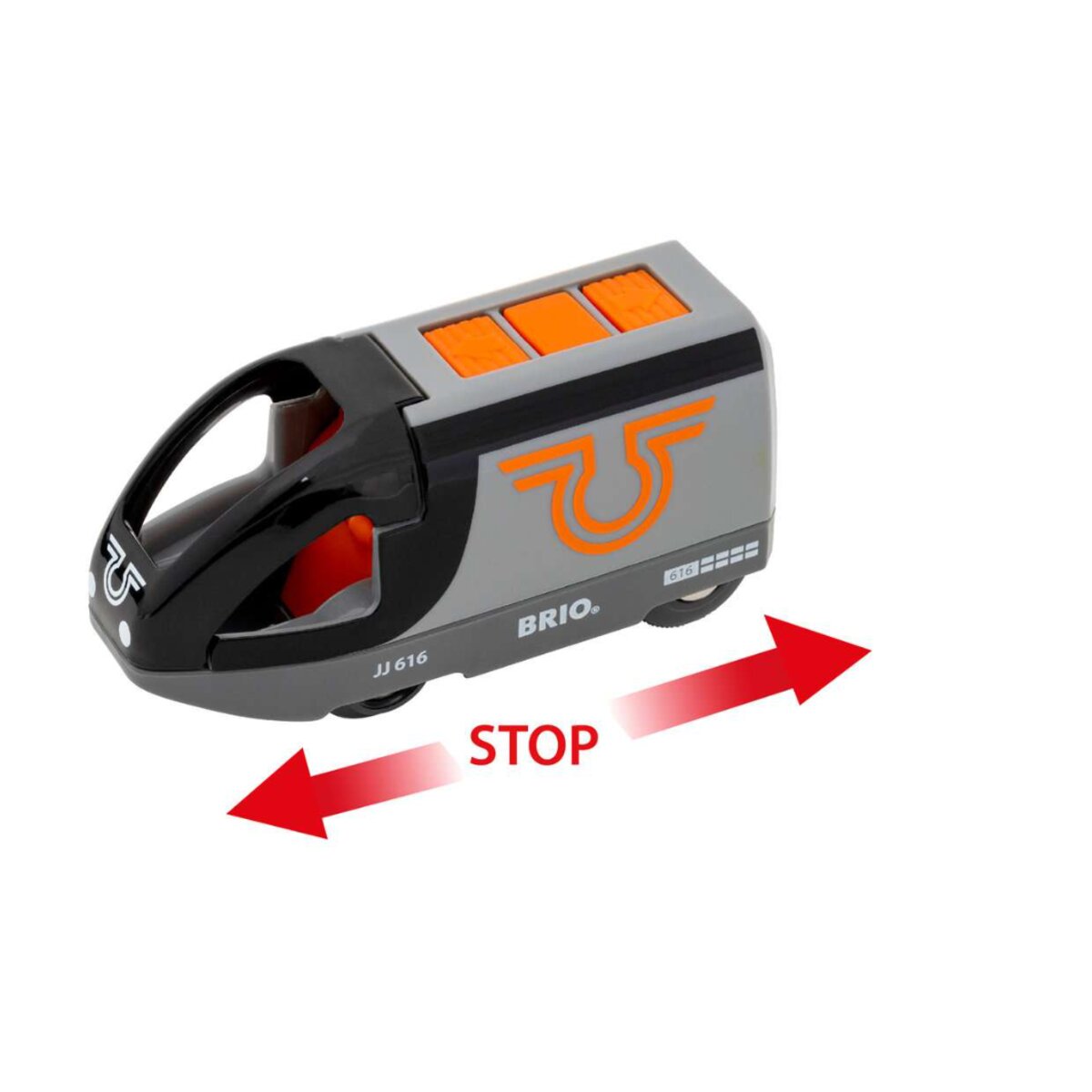 Fahre kreuz und quer auf deiner BRIO World Zugstrecke an Bord des Batteriereisezugs. Diese moderne Lok in Schwarz und Orange ist batteriebetrieben. Mit der einfach zu bedienenden Steuerung auf dem Dach der Lok kannst du ganz leicht vorwärts oder rückwärts fahren und anhalten, sodass dieser Zug immer pünktlich ist. Im vorderen Teil des Spielzeugzugs ist Platz für den Lokführer. Über BRIO World: Die BRIO World ist unser offenes Spielsystem, das mit deinem Kind mitwächst. Alle Spielzeuge der BRIO World passen zusammen und lassen sich zu einer Spielewelt kombinieren, die sich hervorragend eignet, um die kindliche Entwicklung zu fördern. Endlose fantasievolle Spielmöglichkeiten warten nur darauf, von dir entdeckt zu werden. Der 36047 Batteriebetriebene Reisezug enthält 2 Teile: 1 x Batteriereisezug, 1 x Lokführer-Spielfigur