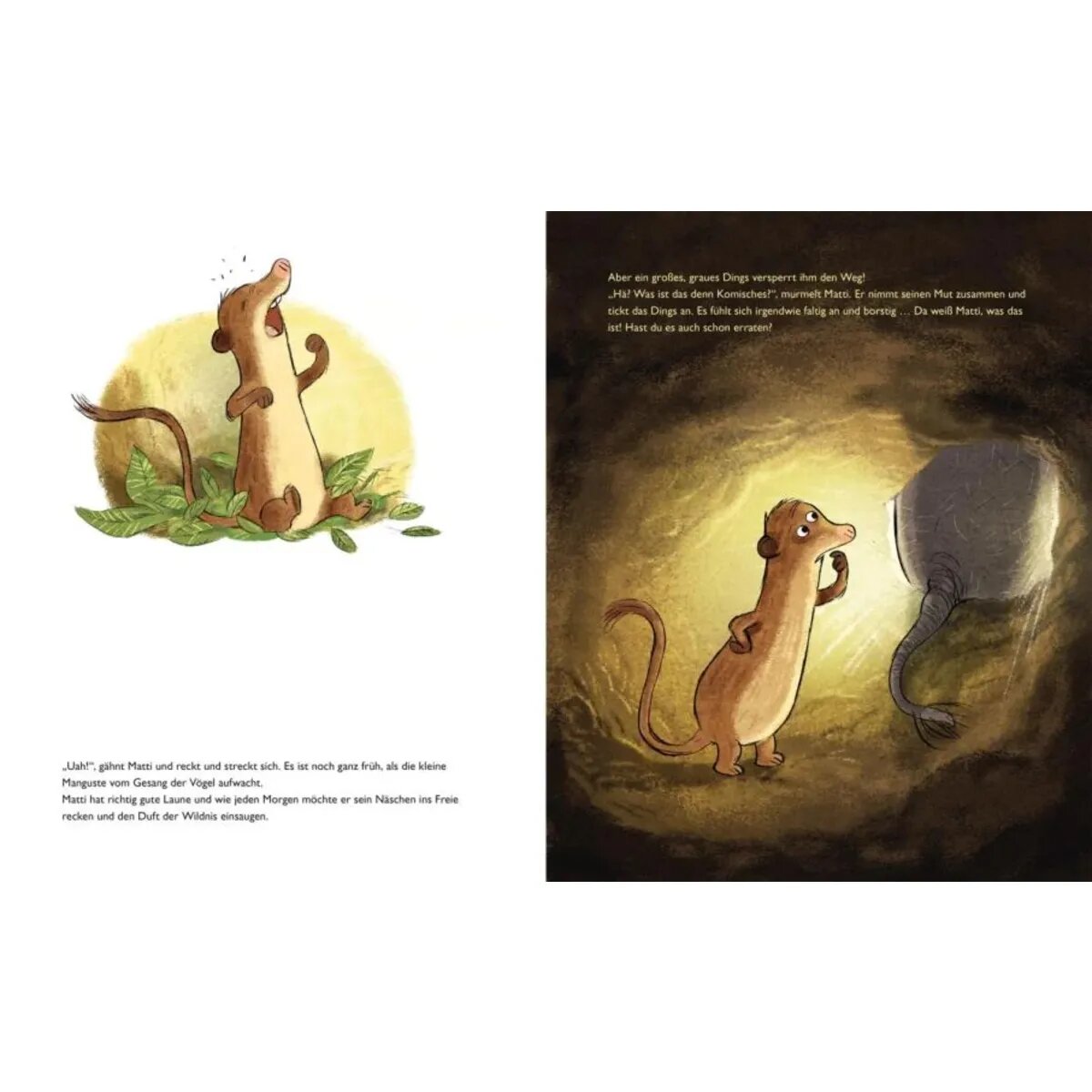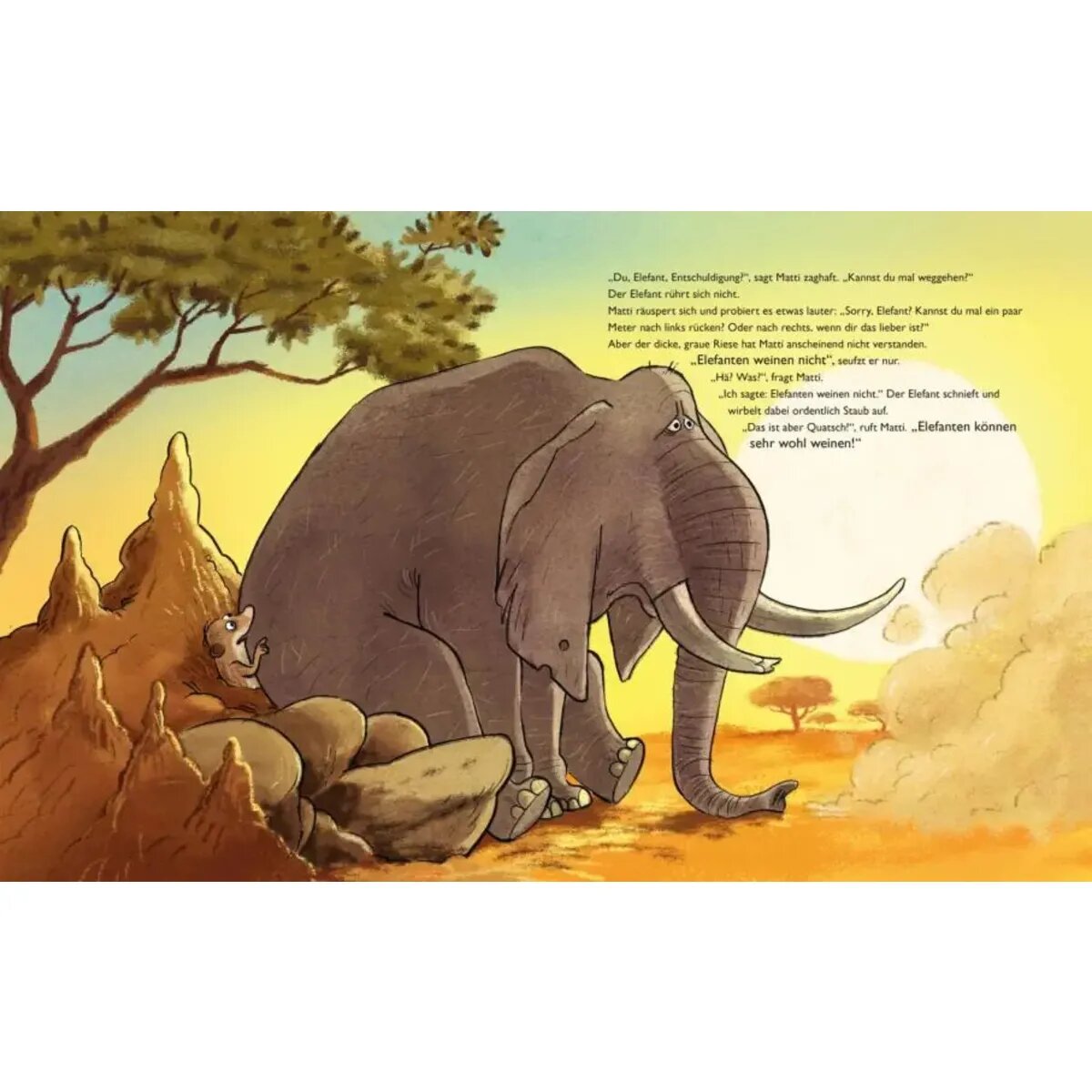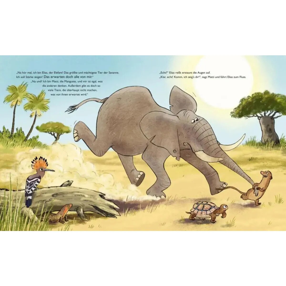 Es ist ein ganz gewöhnlicher Morgen in der Savanne – anscheinend zumindest. Matti, die kleine Manguste, wacht auf und möchte das Näschen ins Freie recken. Nur, das geht nicht! Vor dem Eingang seines Baues hockt ein riesengraues Dings mit faltigem, borstigem Popo und versperrt Matti Weg und Sicht. Das ist Elias, der alte Elefant. Er ist sehr, sehr traurig – aber er hat verinnerlicht, dass Elefanten nicht weinen. Dabei würde er doch so gerne … Also sitzt Elias da so rum, seufzt und weiß nicht weiter. Zum Glück ist Matti ziemlich nett und auch ganz schön schlau. Die Manguste weiß genau, dass es viel, viel besser ist, zu fühlen und zu tun, was wir wollen – und nicht, was wir angeblich sollen. Er führt Elias am Rüssel durch die Savanne und sie treffen: einen Löwen, der sich fürchtet, obwohl doch alle Tiere ihn fürchten, er selbst aber keine Angst haben soll. Ein Nilpferd, das tagsüber am Ufer grast, und eine Leopardin, die auf ein Affenbaby aufpasst, statt es zu jagen. Elias ist verblüfft und er versteht, dass er sehr wohl zu seinen Gefühlen stehen und weinen darf. Und das macht er dann auch. Aber nicht mehr vor Traurigkeit, sondern vor Rührung und Freude. Endlich hat er einen Freund gefunden, der ihm geholfen hat, zu sein, wie er will. Und außerdem bilden Matti und Elias am Ende eine Herde – auch wenn Mangusten und Elefanten das eigentlich nicht sollen …