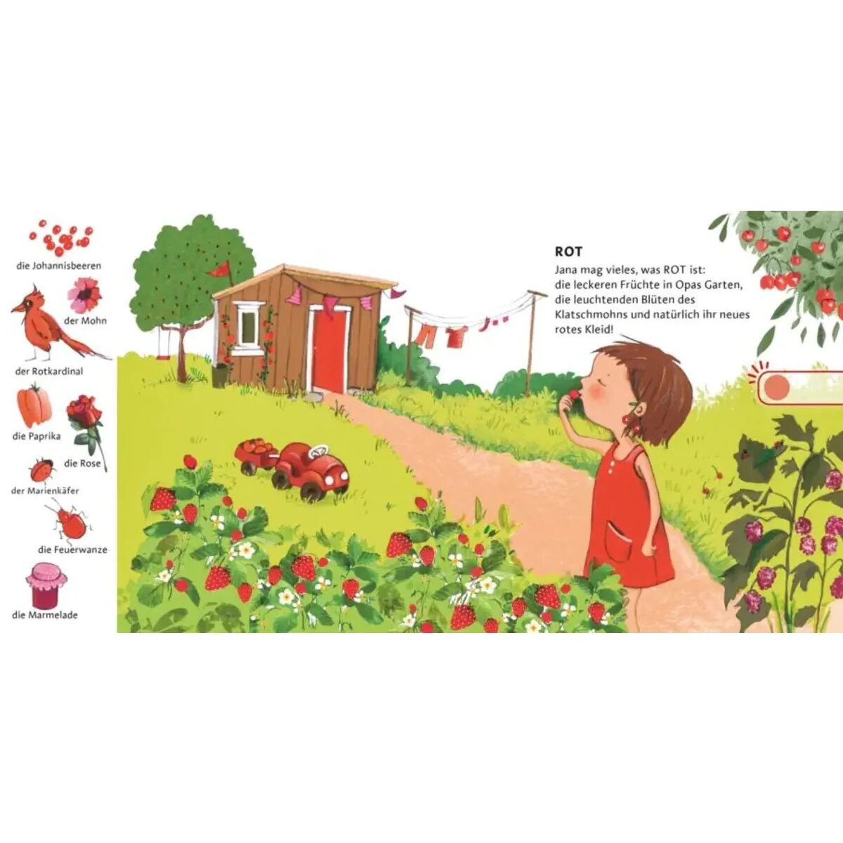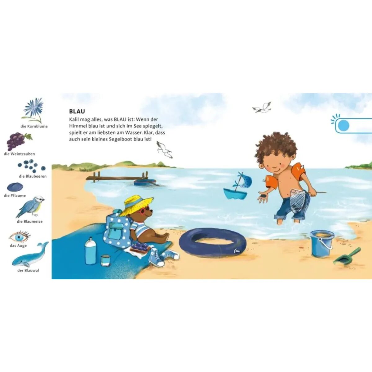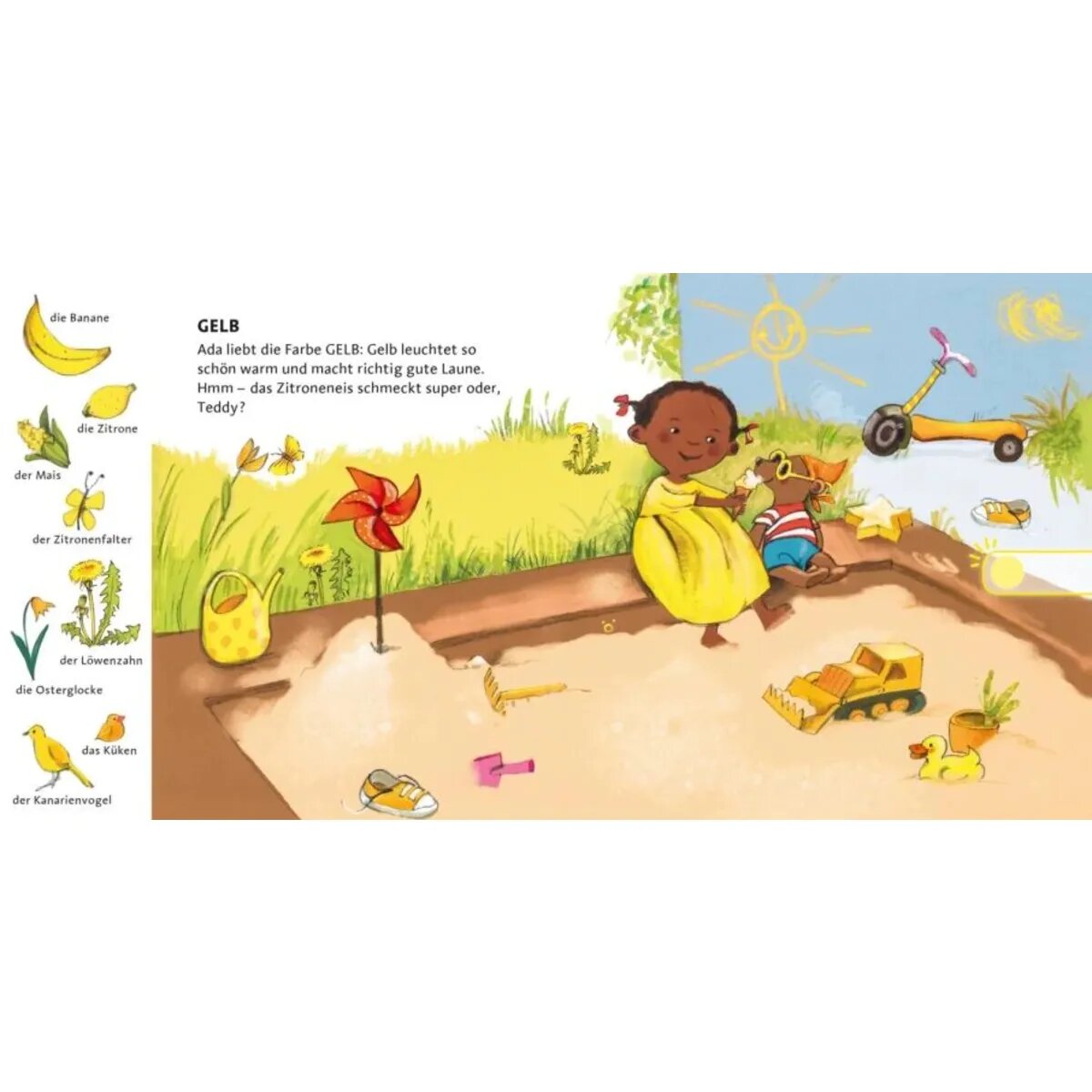 Auf jeder Seite geht es um ein Kind und seine Lieblingsfarbe: Kalil mag am liebsten Blau. Jana Rot und Ada liebt die Farbe Gelb. Alle im Lied besungenen Gegenstände lassen sich im Bild wiederfinden. Da heißt es zuhören und hingucken. Wer findet die Dinge? Und wer singt mit?