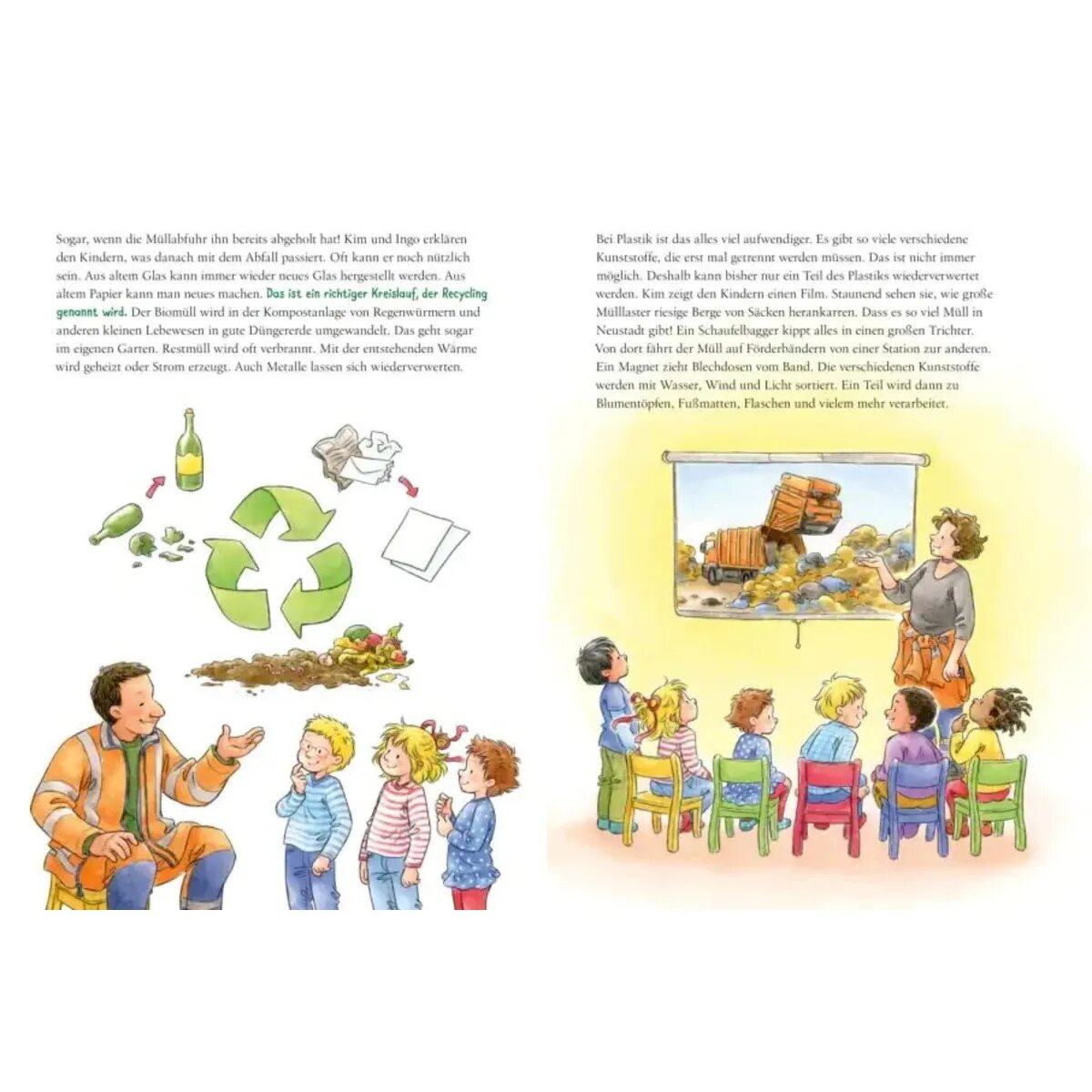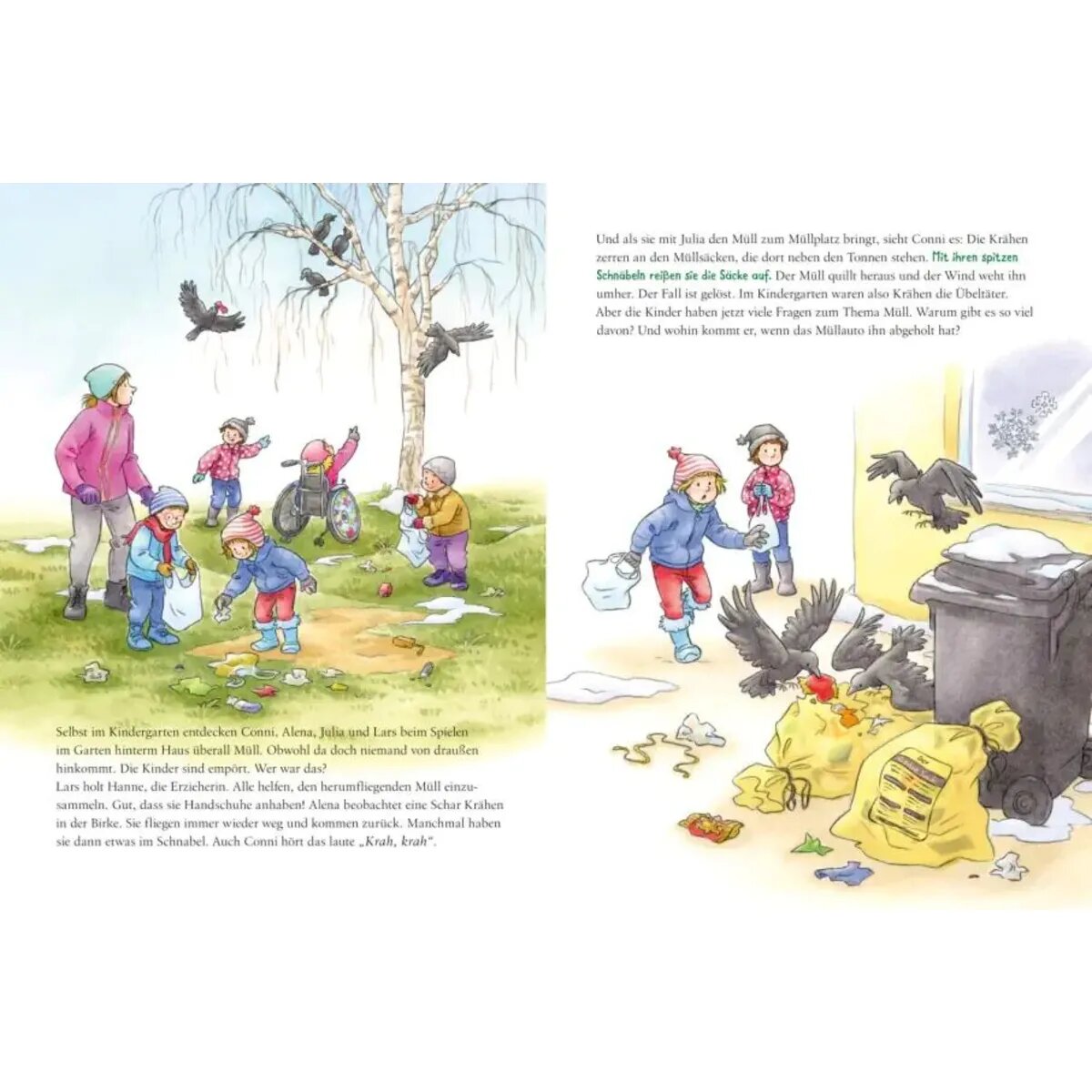 Conni und ihre Freund*innen aus der Kita beschließen: Dagegen müssen sie etwas tun. Dabei lernen sie nicht nur, wie Müll entsteht, sondern auch, wie sie ihn vermeiden und richtig entsorgen können, und warum Plastik besonders problematisch ist. Sie reden mit Mitarbeiter*innen der städtischen Entsorgungsbetriebe, engagieren sich bei einer Müllsammelaktion und retten sogar eine Ente im Stadtpark.