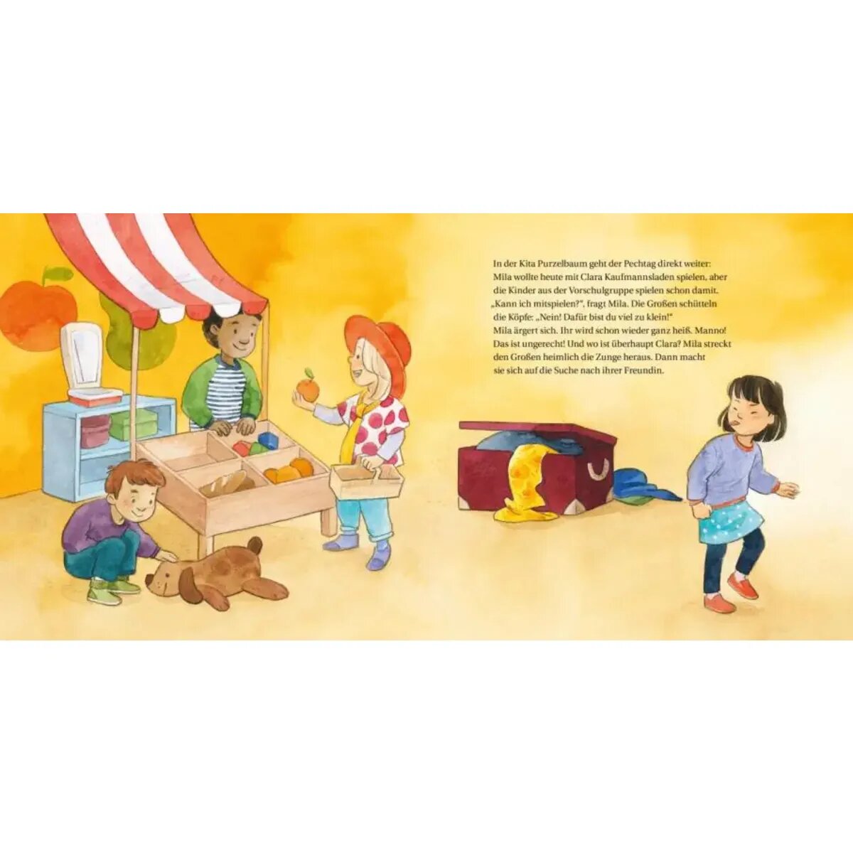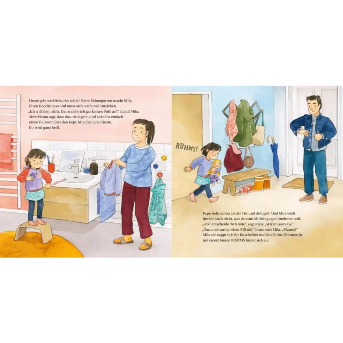 Mila muss sich heute furchtbar ärgern. Es geht einfach alles schief. In der Kita ist der Kaufladen schon besetzt, ihre beste Freundin ist krank und dann läuft auch noch Wasser über ihr schönes Bild. Mila wird wütend. Richtig wütend! Es rumort und brodelt in ihrem Bauch. Ihr wird heiß und kalt. Die Wut muss raus! Aber wie?