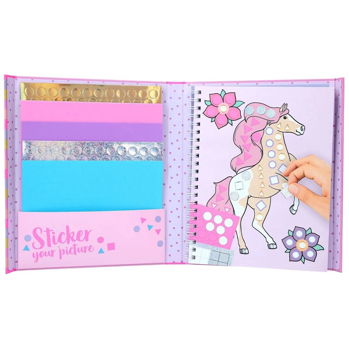 Sticker your picture: In dem Kreativbuch von Miss Melody mit Spiralbindung und Magnetverschluss kann man wunderschöne Pferdebilder mit farblich passenden Stickern und Folien vervollständigen. 25 ponytastische Motive und 10 Seiten Sticker in 5 verschiedenen Farben.