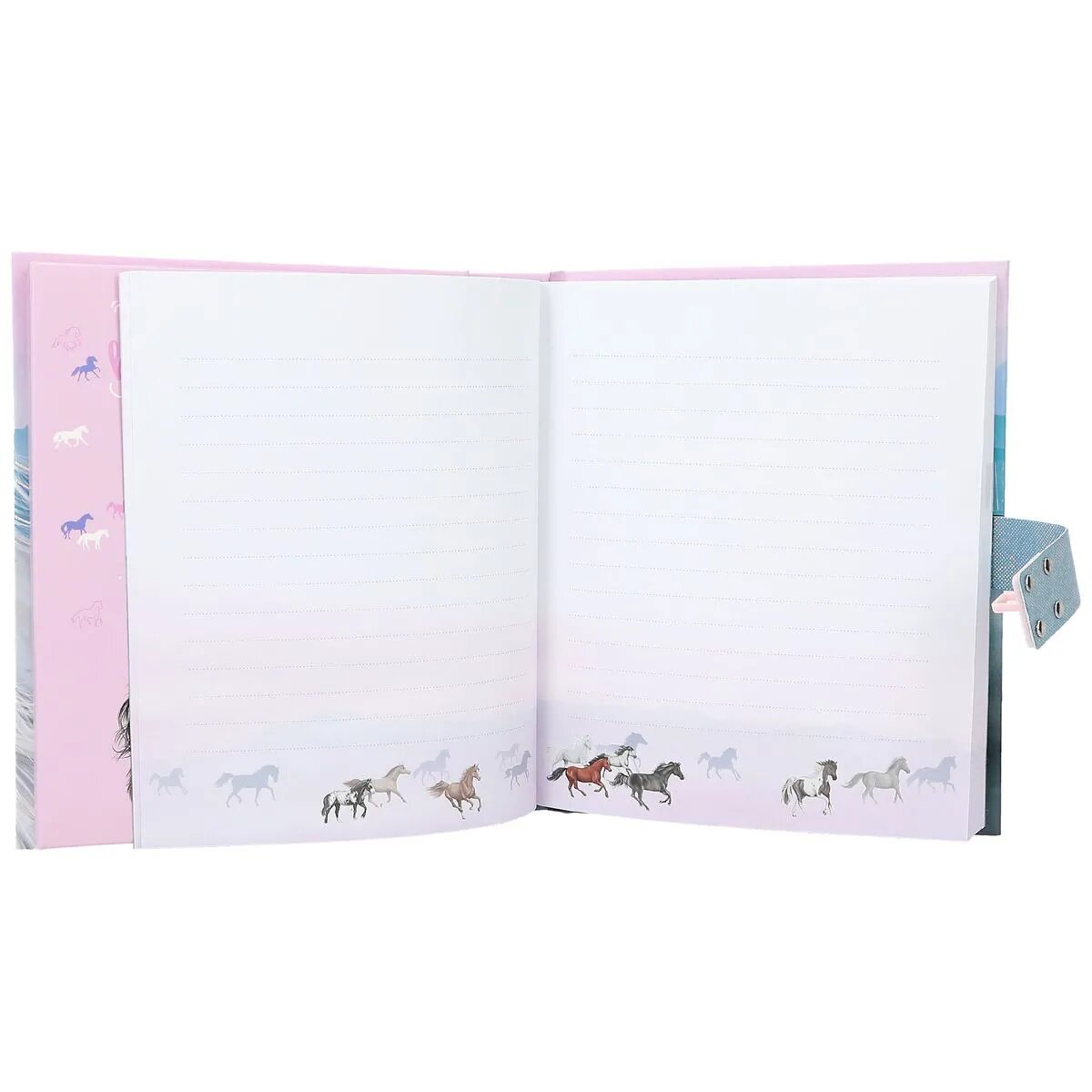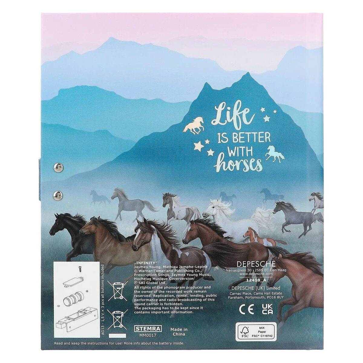 Für geheime Gedanken und Träume: Das Tagebuch hat ein wunderschönes Cover mit Miss Melody und einer Herde galoppierender Pferde. Das Schloss öffnet sich nur, wenn der richtige vierstellige Code (persönlich einstellbar) eingegeben wird. Dann spielt auch der Top-Hit Infinity für ca. 20 Sekunden. Innen hat das Tagebuch 80 liebevoll illustrierte, fein linierte Seiten.