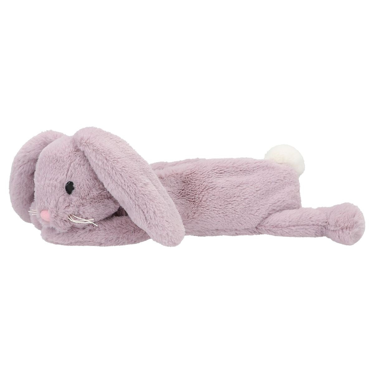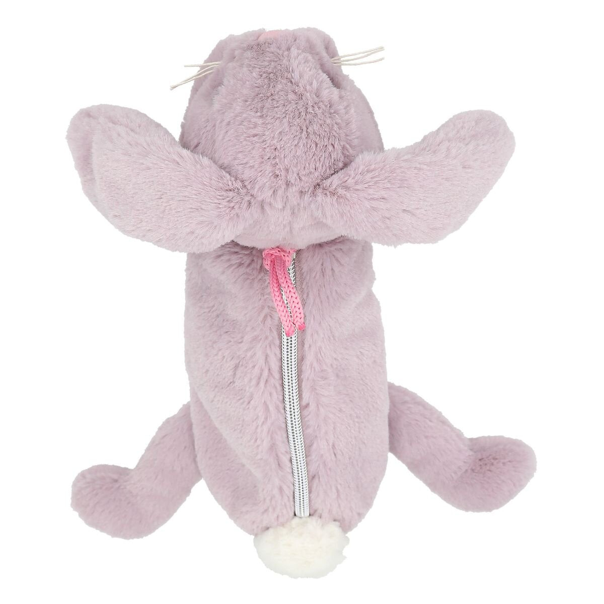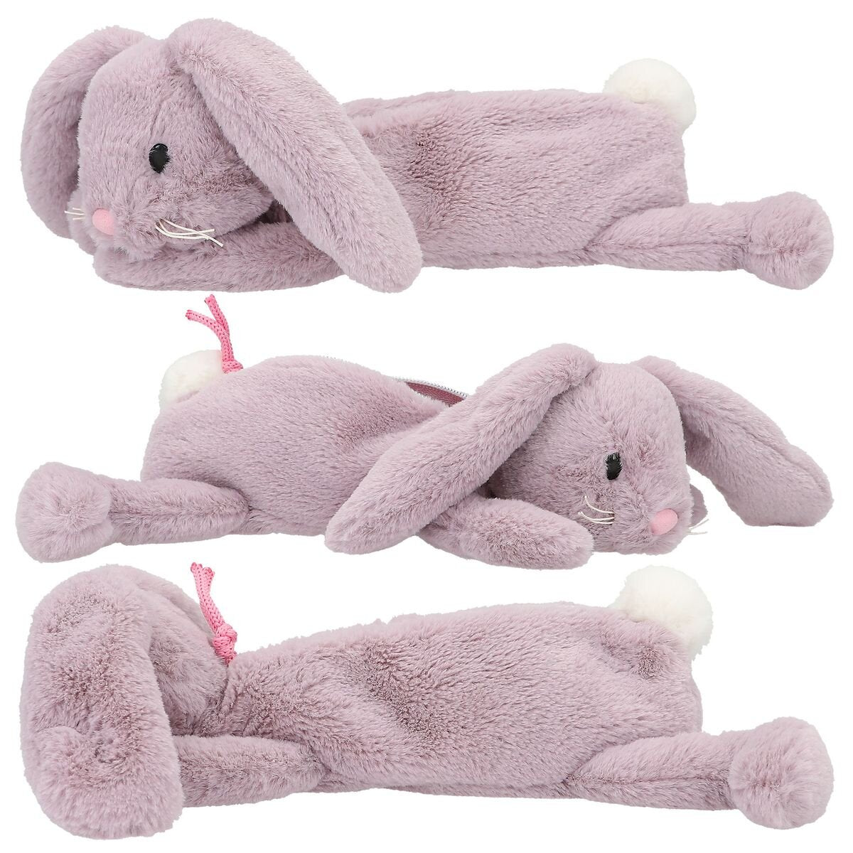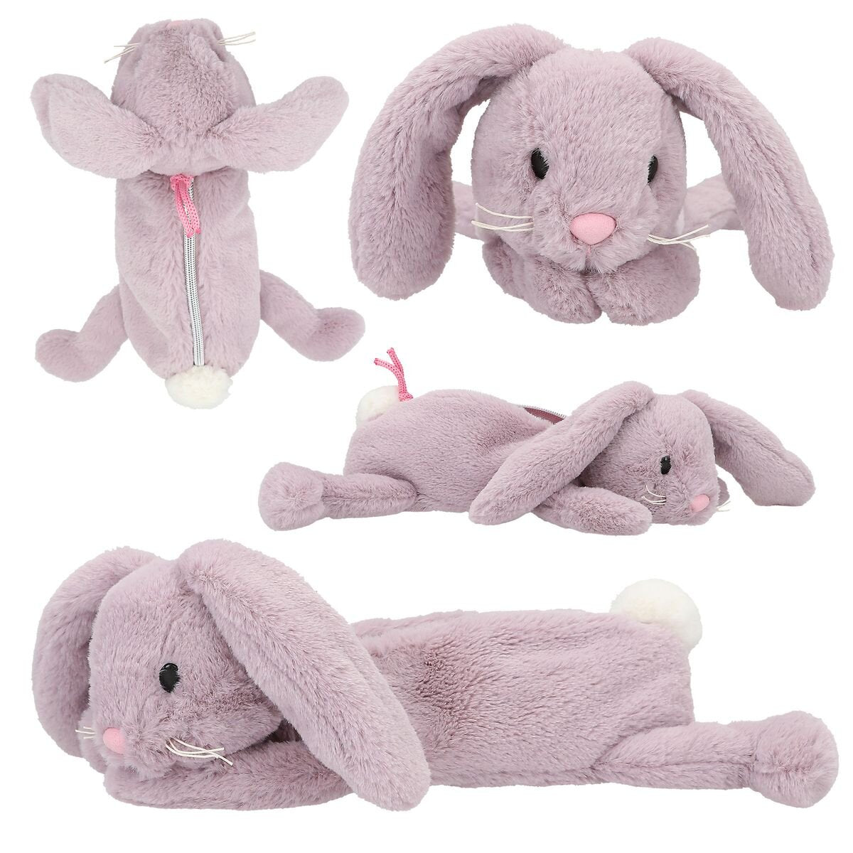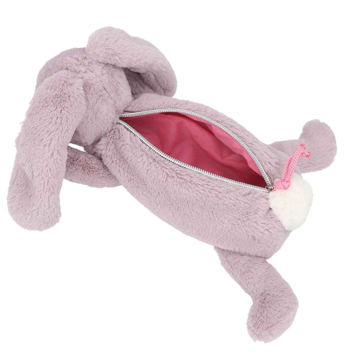 Der kuscheligste Platz für Stifte & Co: die Plüsch-Schlampertasche von Princess Mimi in niedlicher Hasenform. In sanftem Lila, mit schwarzen Knopfaugen, rosa Näschen und rosa Schleifchen als Reißverschluss-Anfasser. Material: 100 Prozent Polyester