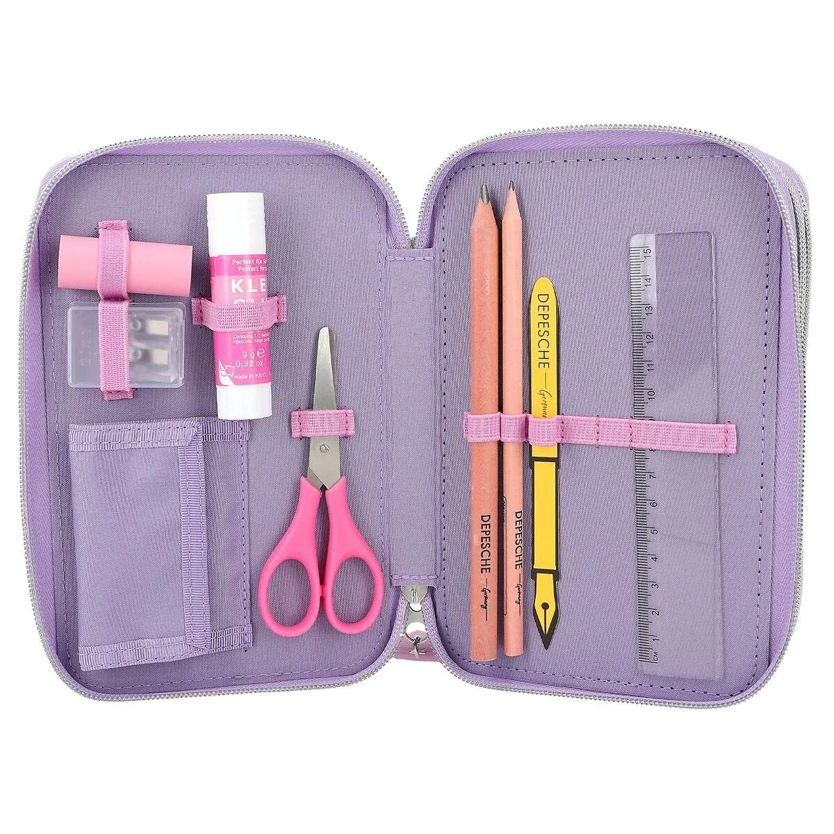 Eine wunderschöne Meerjungfrau und süße Axolotl! Die TOPModel-Federtasche ist aber auch innen ein Highlight: Die drei separaten Fächer sind komplett gefüllt mit je 18 Bunt- und Filzstiften, 2 Bleistiften, Anspitzer, Radierer, Lineal, Schere und Klebestift. Mit dabei und so niedlich: der Axolotl-Anhänger am Reißverschluss. Material: 100 Prozent PES