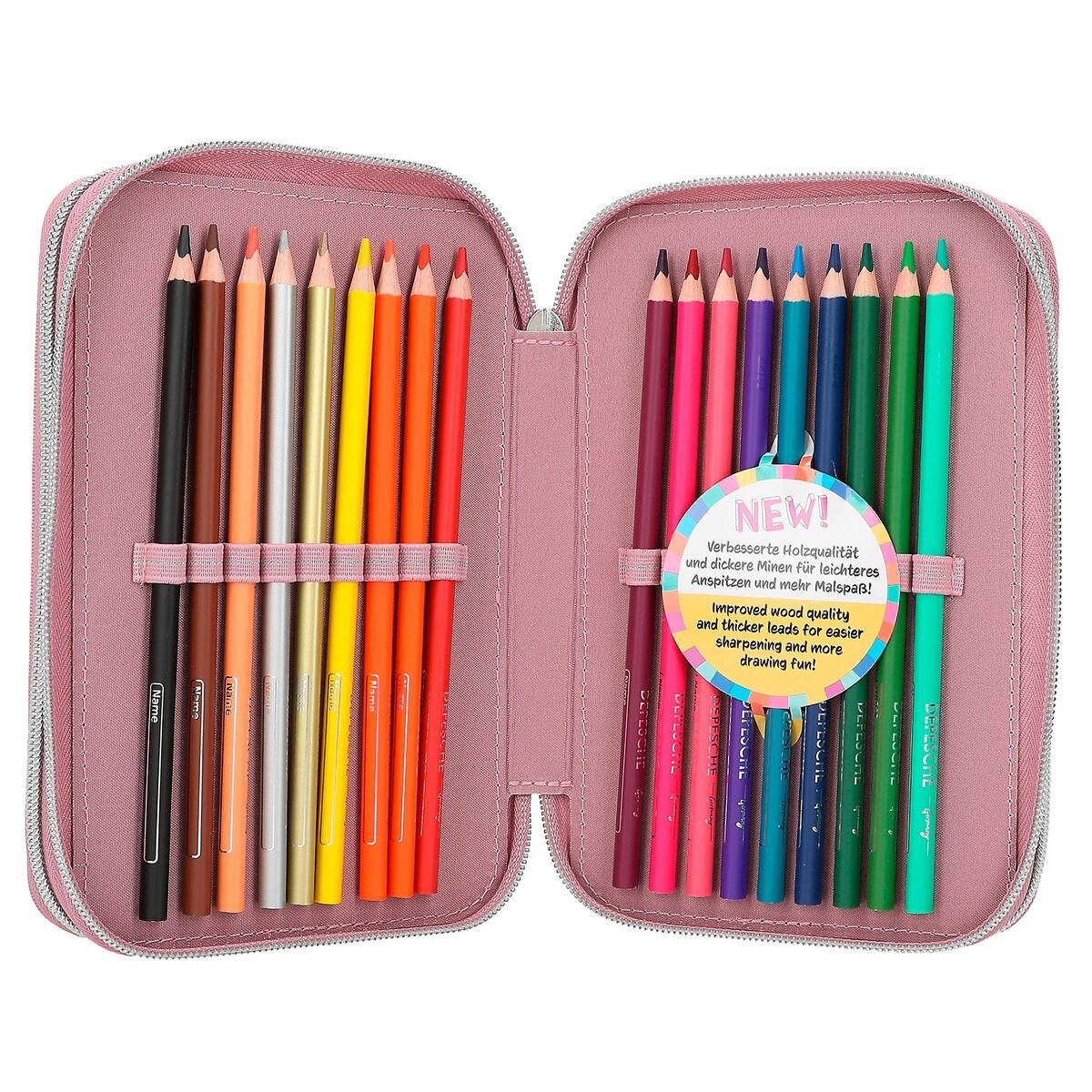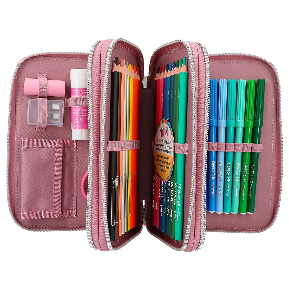 Glitzer, Glamour, genial: Die 3-Fach-Federtasche von TOPModel mit viel zartem Rosé hat ein komplett mit Glitzer hinterlegtes großes Model-Motiv auf der Front und als süßes Highlight eine kleine Druckknopf-Tasche aus Glitzerstoff als Reißverschluss-Anhänger. Die drei separaten Fächer sind komplett gefüllt mit je 18 Bunt- und Filzstiften, 2 Bleistiften, Anspitzer, Radierer, Lineal, Schere, Klebestift und einem kleinen Klett-Täschchen. Material: Front 100 Prozent PES und PVC; Besatz 100 Prozent Polypropylene