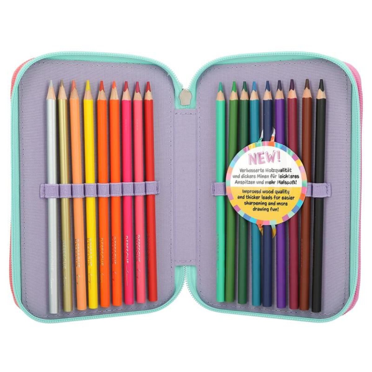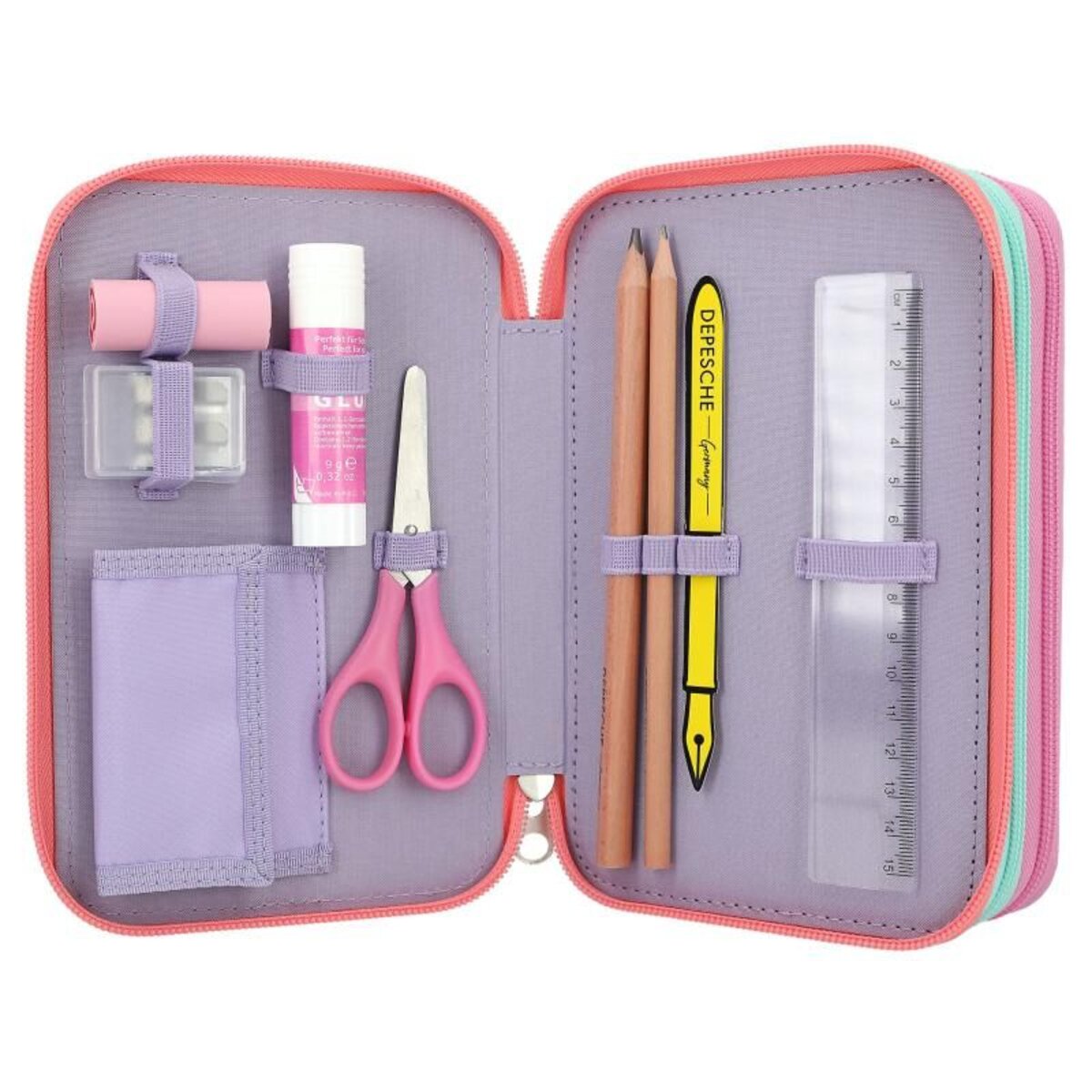 Coole Schnappschüsse von den TOPModels: Die lilafarbene TOPModel-Federtasche Snap Shots hat vier bunte Model-Motive auf der Front sowie kleine, süße Stickerei-Details. Die drei verschiedenfarbigen Reißverschlüsse setzen tolle Akzente und das bedruckte Band am Reißverschluss ist abnehmbar. Die Fächer der Federtasche sind komplett gefüllt mit je 18 Bunt- und Filzstiften, 2 Bleistiften, Radierer, Anspitzer, Lineal, Schere, Klebestift und einem kleinen Klett-Täschchen. Material: 100 Prozent PES
