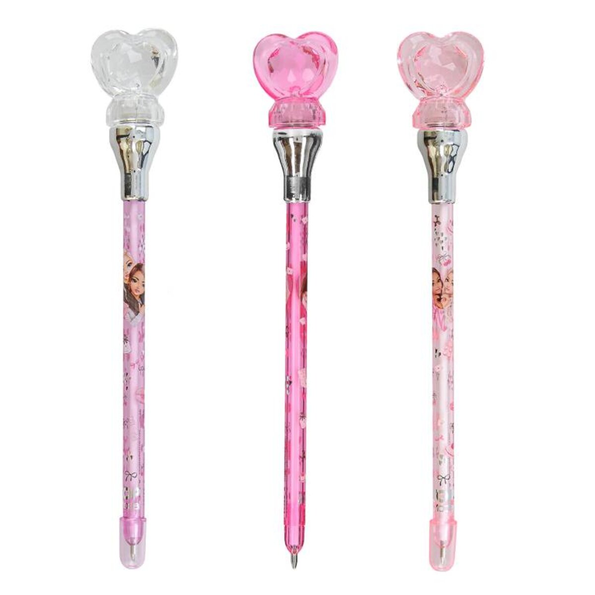 Beim Schreiben geht ein Licht auf: Die TOPModel-Kugelschreiber haben transparente Herz-Topper mit Lichtfunktion. Diese leuchten durch das Aufdrücken der Minen-Spitze (blaue Tinte) auf.