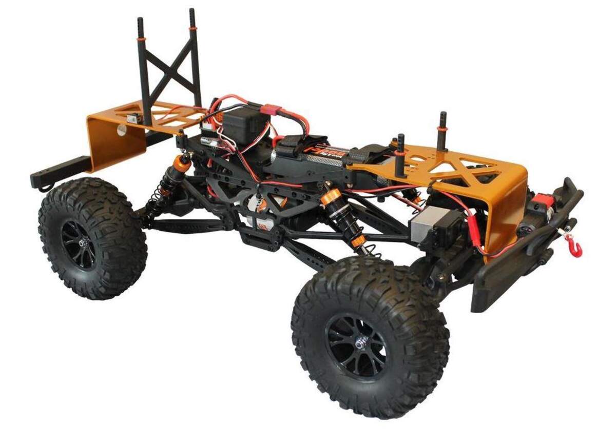 Ausgestattet mit einem speziellen, LiPo-tauglichen, Crawler Regler sowie einem Spezial-Crawler-Motor. Die Starrachsen mit Differentialsperren trotzen jedem Gelände und lassen die unmöglichsten Fahrmanöver im Gelände zu. Das per Fernsteuerung schaltbare 2-Gang-Getriebe lässt zügiges Fahren oder sehr langsames Crawlen zu. Die maximale Spitzengeschwindigkeit ist zudem per Dual-Rate an der Fernsteuerung von 0 – 100 % einstellbar. Ebenfalls über die 5-Kanal-Fernsteuerung schaltbar ist die bereits eingebaute NEUE LED-Beleuchtung mit Blinkern usw. Die im Sondermodell verbaute Seilwinde kann ebenfalls per Fernsteuerung bedient werden (Vor-/ Rückwärts). Viele Tuningteile wie z. B. eine Allradlenkung lassen viel Spielraum, um das Modell zu individualisieren und tunen.