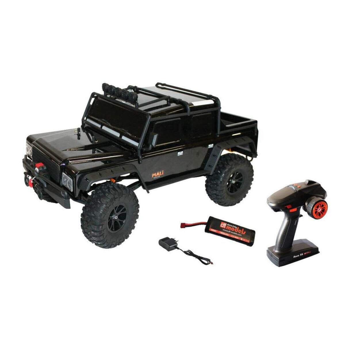 XXL-Monsterreifen, extreme Bodenfreiheit und enorme Federwege, dies zeichnen den DF-4J Crawler aus. Ausgestattet mit einem speziellen, LiPo-tauglichen, Crawler Regler sowie einem Spezial-Crawler-Motor. Die Starrachsen mit Differentialsperren trotzen jedem Gelände und lassen die unmöglichsten Fahrmanöver im Gelände zu. Das per Fernsteuerung schaltbare 2-Gang-Getriebe lässt zügiges Fahren oder sehr langsames Crawlen zu. Die maximale Spitzengeschwindigkeit ist zudem per Dual-Rate an der Fernsteuerung von 0 – 100 % einstellbar. Ebenfalls über die 5-Kanal-Fernsteuerung schaltbar ist die bereits eingebaute NEUE LED-Beleuchtung mit Blinkern usw. Die im Sondermodell verbaute Seilwinde kann ebenfalls per Fernsteuerung bedient werden (Vor-/ Rückwärts). Viele Tuningteile wie z. B. eine Allradlenkung lassen viel Spielraum, um das Modell zu individualisieren und tunen. Das Modell ist Ready To Run mit 2,4 GHz Fernsteuerung, NiMH Akku und Steckernetzlader. Eine Fahrzeit von 40-60 Minuten ist mit dem DF-4J möglich. Lieferumfang: Crawler RTR 2,4 GHz 5-Kanal Fernsteuerung Seilwinde, 2-Gang-Getriebe (bereits montiert) NiMH Fahrakku - 7,2 Volt - 1800 mAh Ladegerät Anleitung (D/ENG/IT/FR/ES) Technische Daten: Maßstab: 1:10XL Antrieb: 4WD brushed Länge: 560 mm Breite: 305 mm Höhe: 287 mm Radstand: 340 mm Reifen: 125x52 mm