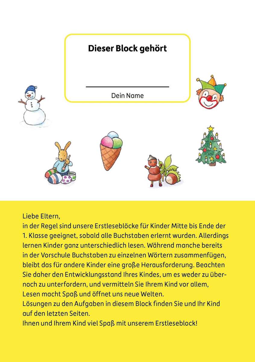 Sobald Kinder alle Buchstaben in der Schule gelernt haben, sind sie unheimlich stolz und machen auch im Lesen immer mehr Fortschritte. Das geht bei manchen Kindern schneller, andere benötigen dafür ein wenig mehr Zeit. Das Lesen üben, müssen aber alle Erstleser. Quer durchs Jahr begleitet dieser Erstleseblock die Kinder mit kurzen Texten und einer passenden kleinen Aufgabe dazu. So ist das tägliche Lesen ohne großen Aufwand und mit viel Freude möglich. Dabei unterstützen die liebevollen Illustrationen das Verständnis der Texte und motivieren die Kinder zusätzlich. Mit den Lösungen können die Aufgaben selbstständig überprüft werden.