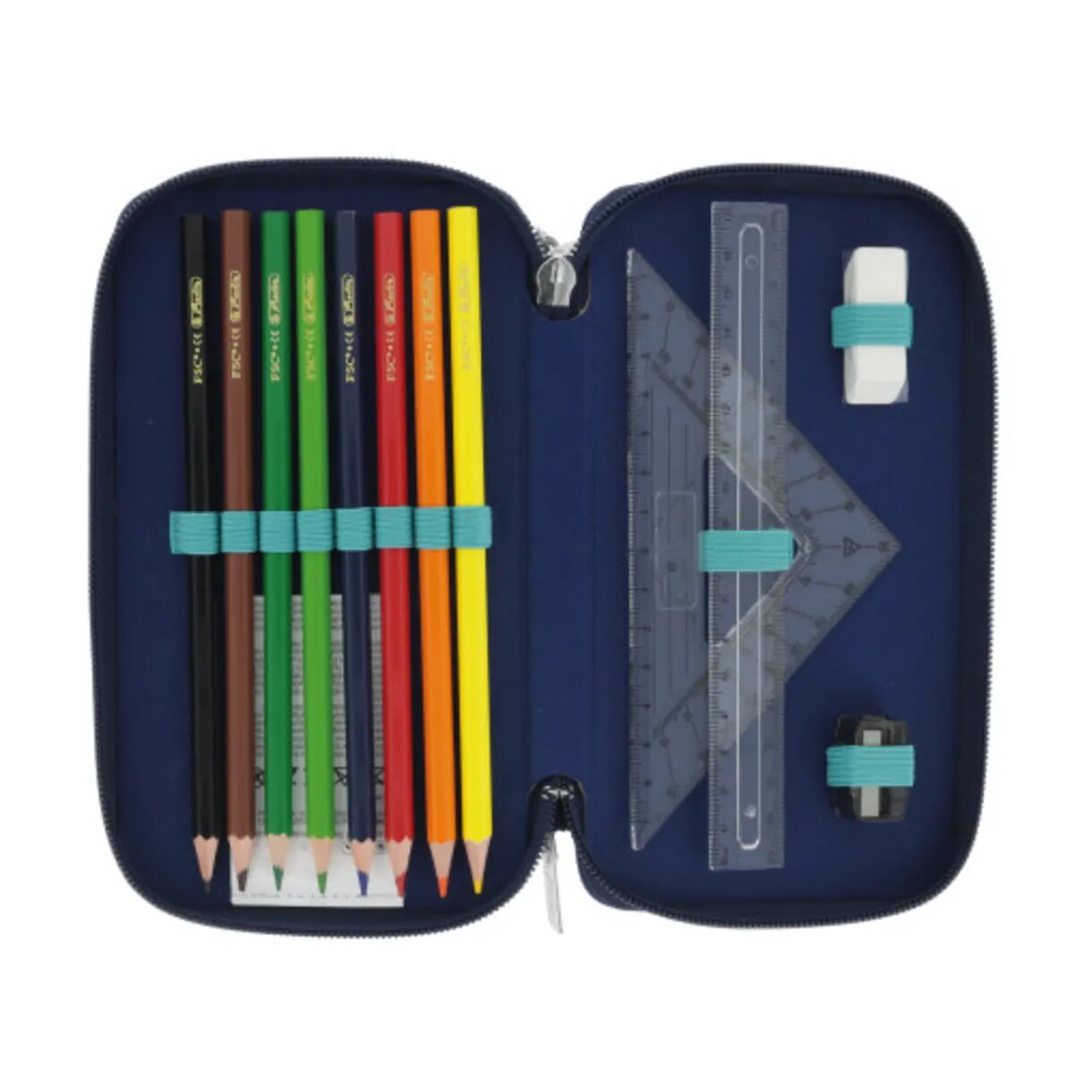 für Schule; Uni oder Beruf; 3 Klappen mit farbigem Reißverschluss; Schlaufen in unterschiedlichen Größen; guter Überblick; leichter Transport; farbiges Innenmaterial farbig passend zum Motiv; farbige Stifteschlaufen; Maße: 19 x 11;5 x 7 cm; Material: Polyester; Motiv: Deep Ocean
