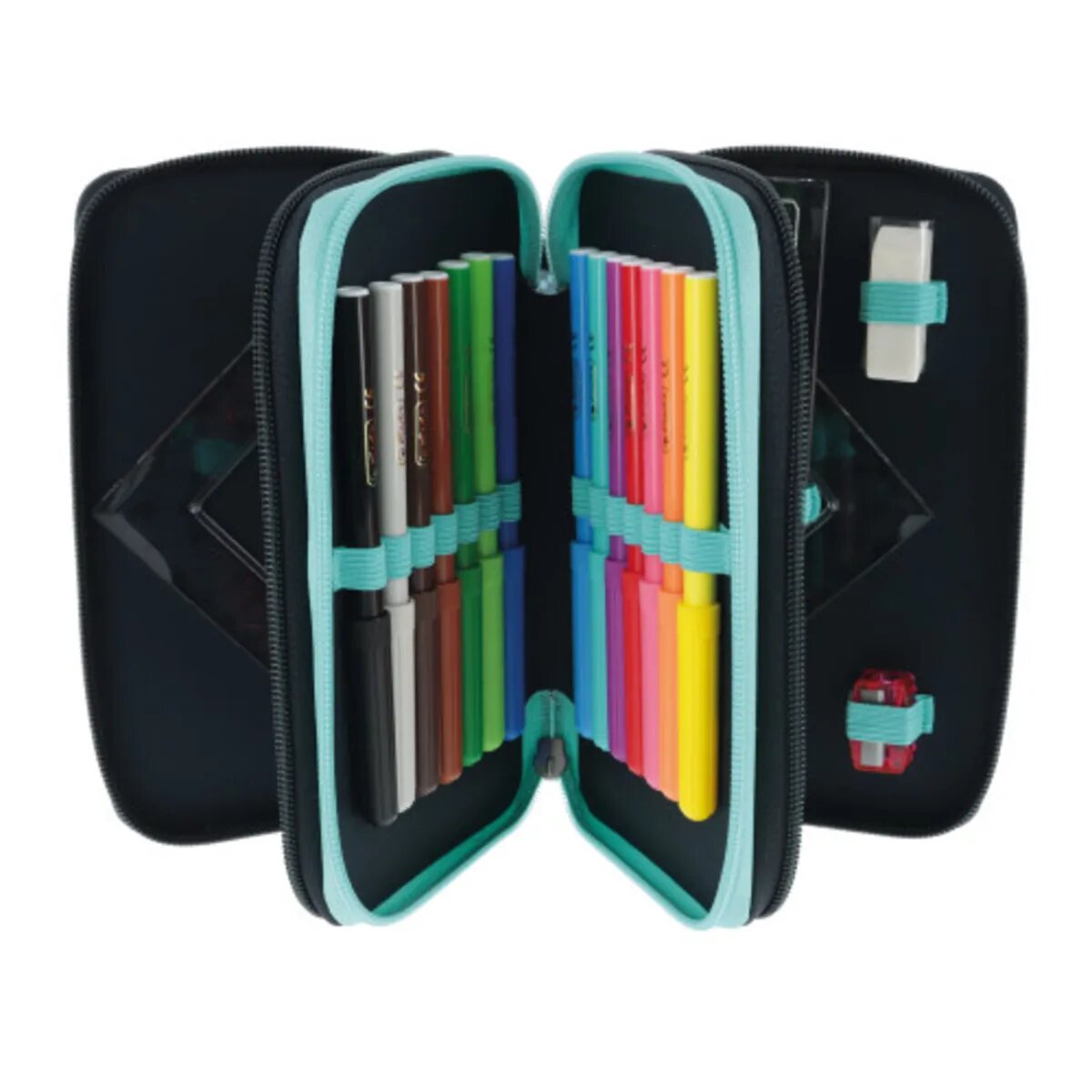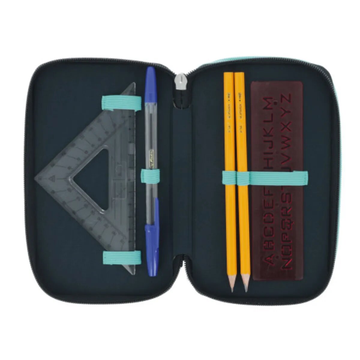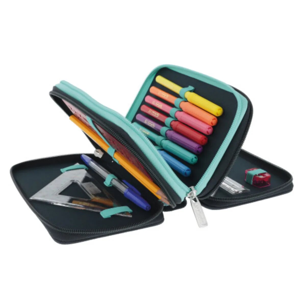 für Schule; Uni oder Beruf; 3 Klappen mit farbigem Reißverschluss; Schlaufen in unterschiedlichen Größen; guter Überblick; leichter Transport; farbiges Innenmaterial farbig passend zum Motiv; farbige Stifteschlaufen; Maße: 19 x 11;5 x 7 cm; Material: Polyester; Motiv: Sweet Jungle