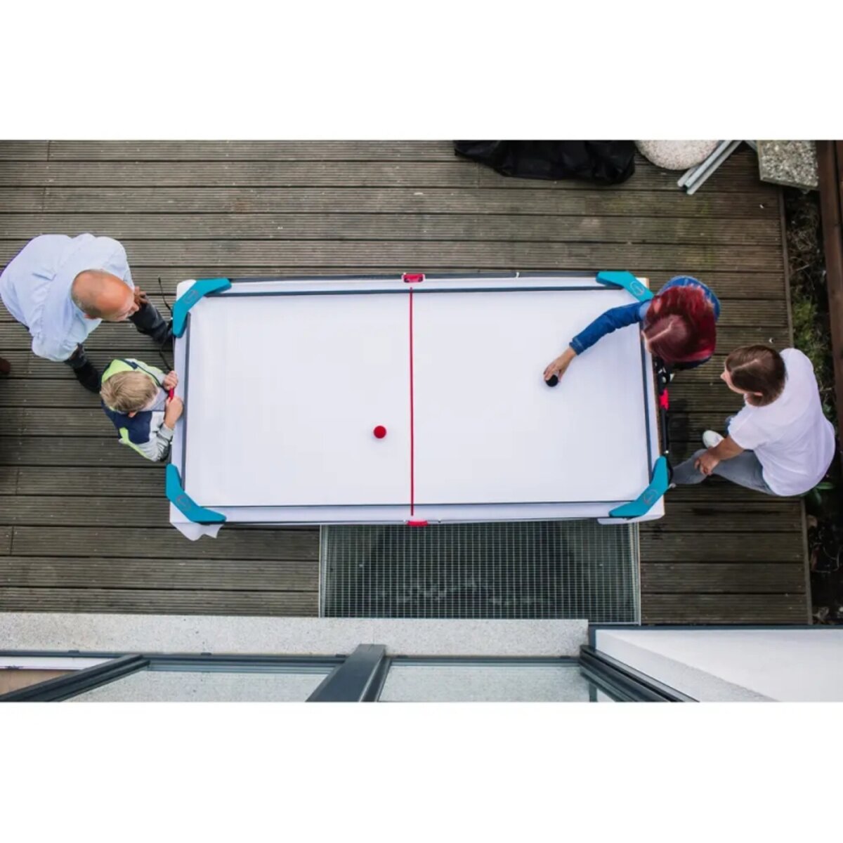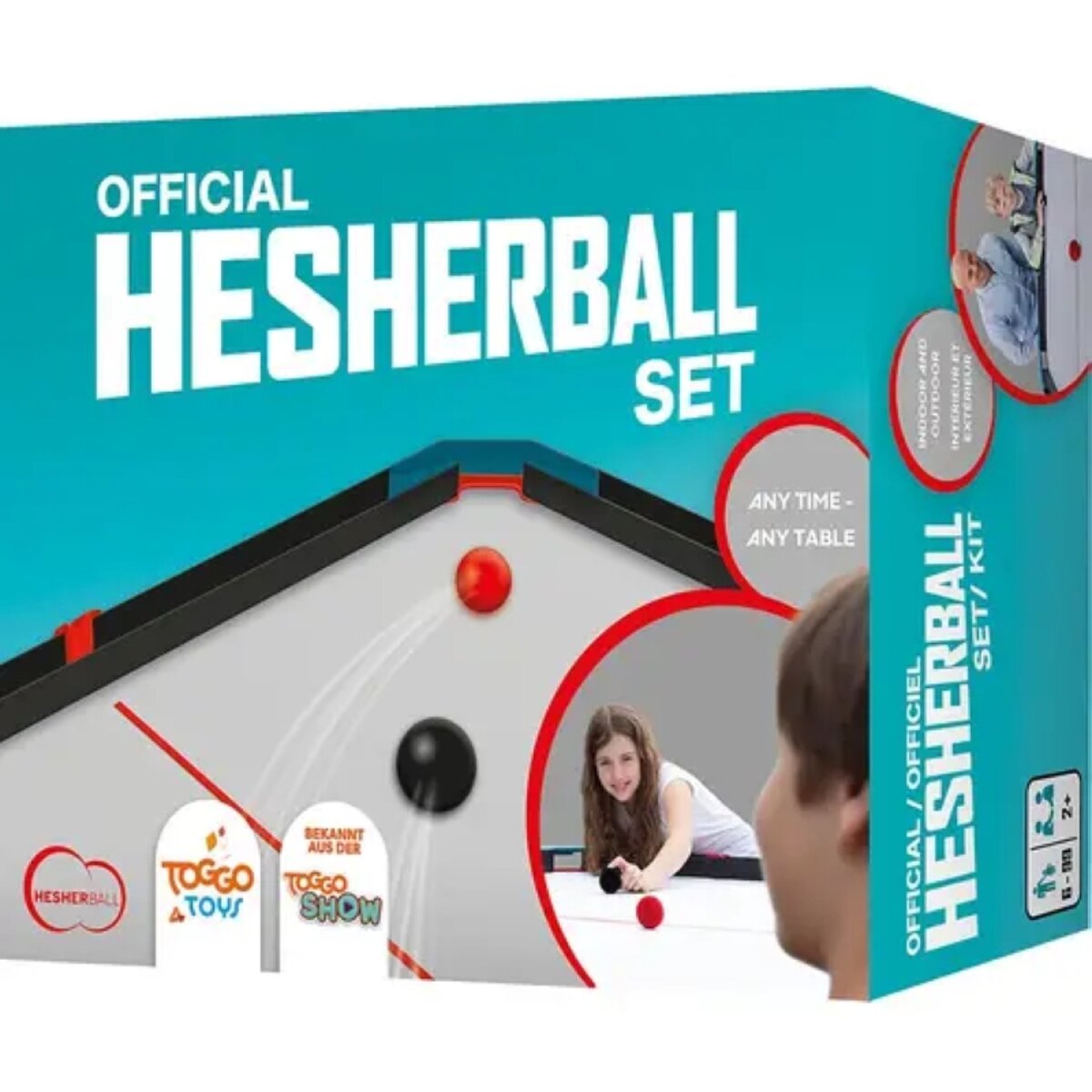 Weg von der Konsole – gemeinsam HesherBall spielen! Blitzschnell verwandelt das innovative Funsportspiel für die ganze Familie deinen Tisch in eine Spielwiese. Die Vorrichtung erinnert zunächst an ein mobiles Billardspiel. Mit seinen dynamischen und simplen Regeln bietet HesherBall jedoch einen aktiven und unkomplizierten Sportspiel-Spaß für drinnen und draußen. Mindestmaß für den Tisch von 100 x 60 cm. Inhalt: 4 x Eckteile/ Hesher-Goals mit Klemmschrauben, 4 x Gurte mit Klippverschluss als Bande, 2 x Vollgummibälle mit Velourüberzug, 1 x rückstandsloses Tape für die Mittellinie.