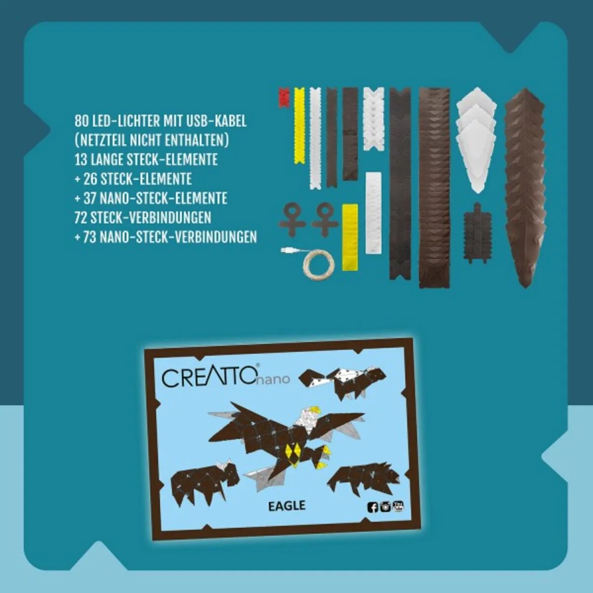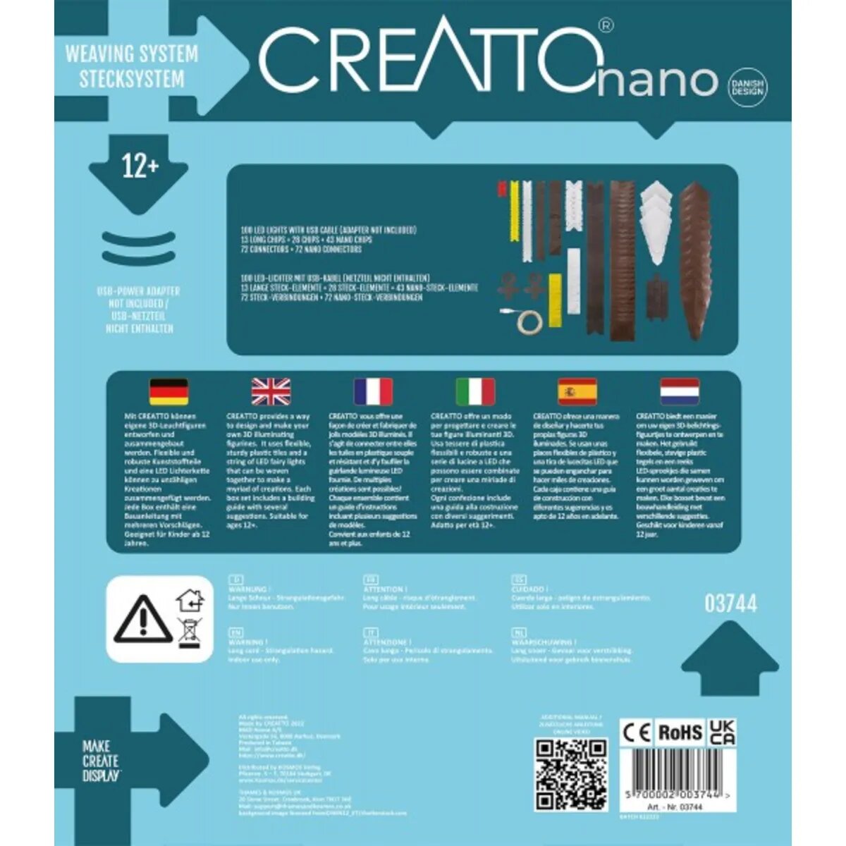 Dieses Bastelset kombiniert clever die bewährten größeren CREATTO-Puzzleteile mit den neuen kleineren nano-Steckteilen und ermöglicht es so, raumgreifende 3D-Modelle mit feinen Details zu bauen und mittels beiliegender LED-Lichterkette zum Leuchten zu bringen.