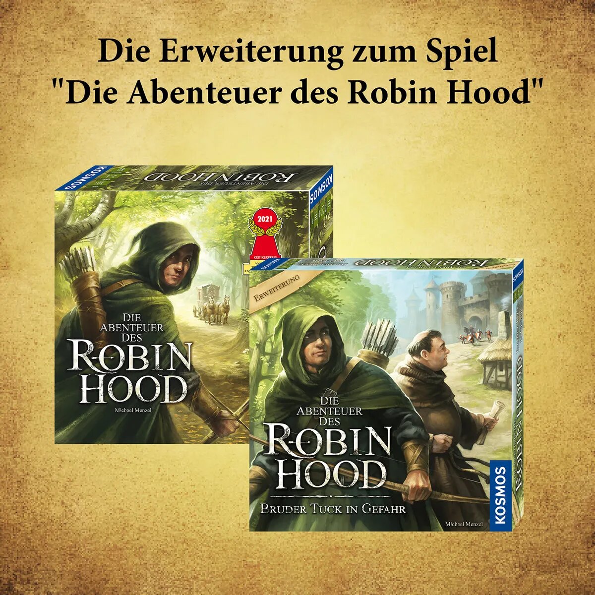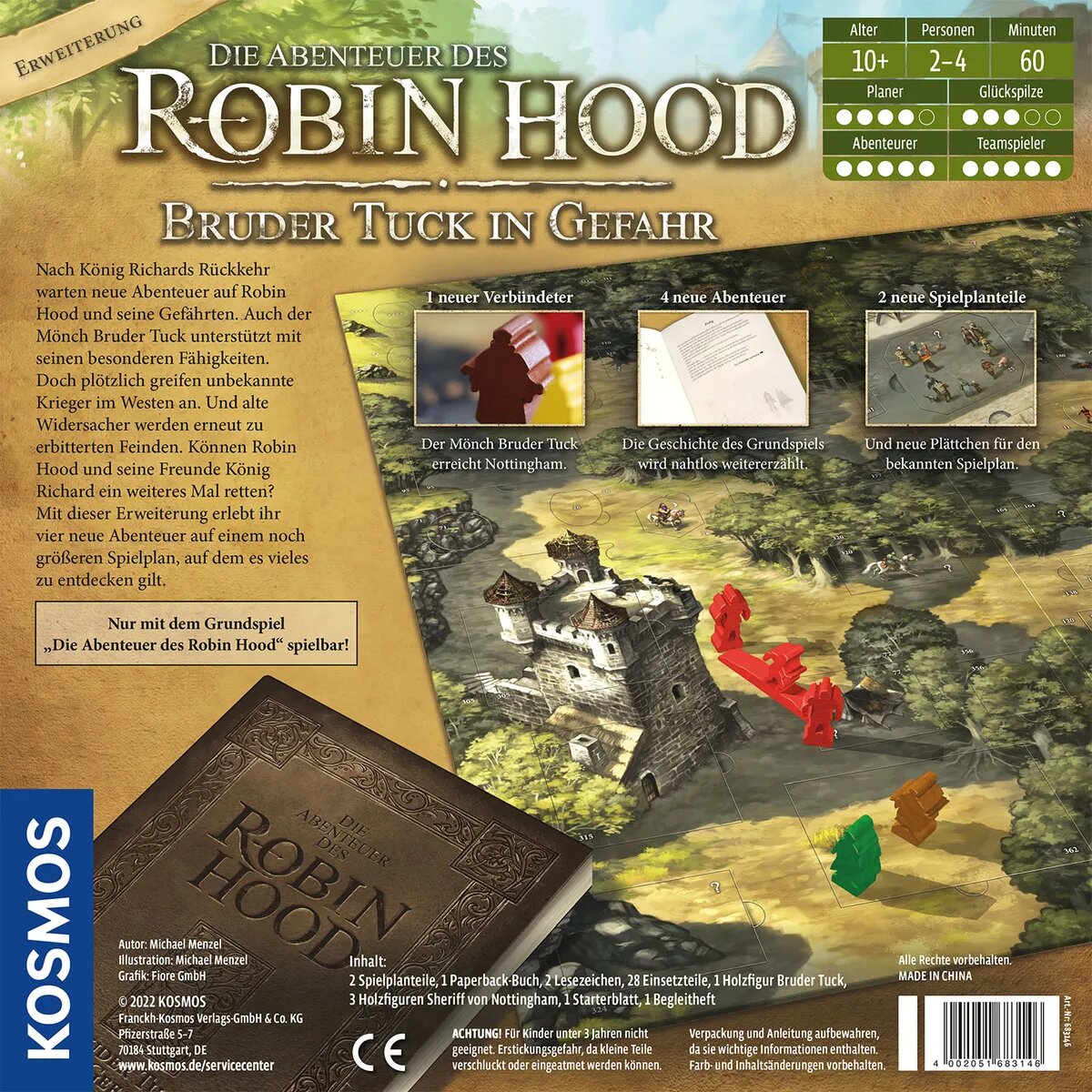 Aufregung in Nottingham! König Richard kommt zurück in die Grafschaft. Doch Gegner wollen seine Rückkehr verhindern. Robin Hood und seine treuen Gefährtinnen und Gefährten sind wieder gefragt! Zusätzlich zum Basis-Spiel mit Hardcover-Buch kommt in der Erweiterung mit Bruder Tuck eine neue beliebte Figur zum kooperativen Brettspiel hinzu. 2-4 Spielerinnen und Spieler ab 10 Jahren bewegen die Figuren jetzt auf einem noch größeren lebendigen Spielplan, auf dem ihre Entscheidungen den Spielverlauf verändern. Wird es den Heldinnen und Helden von Sherwood Forest gelingen, die Gefahren abzuwehren? Das kooperative Spiel mit vier neuen Abenteuern für Robin Hood und Co. ist ein großer Spaß für die ganze Familie.