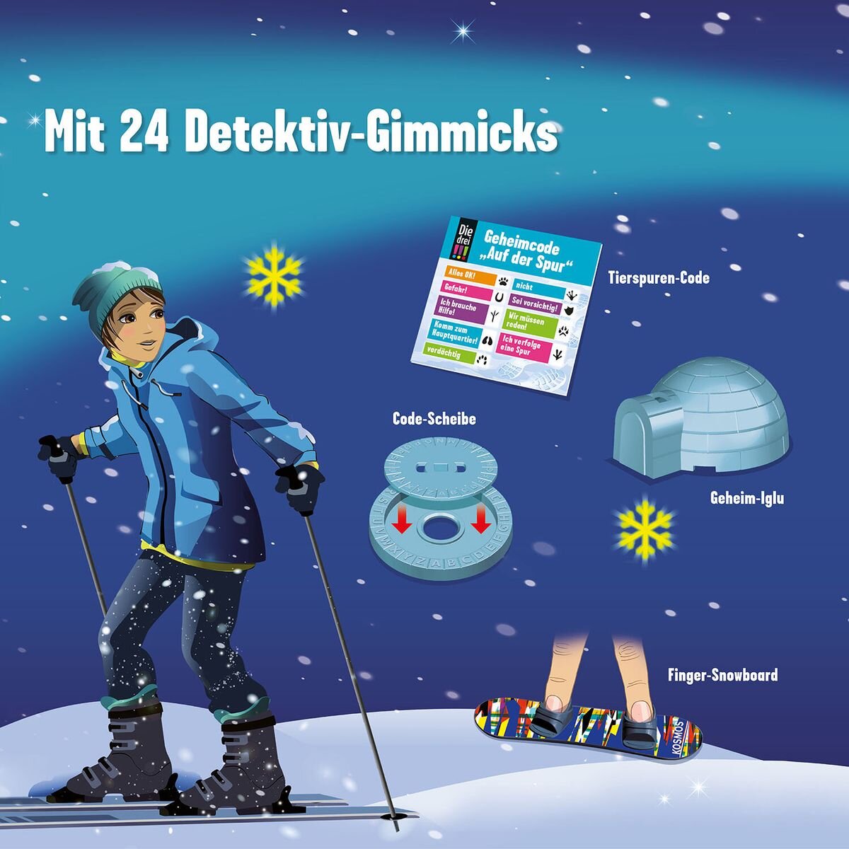 Knobeln im Advent! Die drei !!! Franzi, Kim und Marie sind mit einer Jugendgruppe auf Skifreizeit. Sie retten sich vor einem Schneesturm in eine Schutzhütte. Dort stimmt etwas nicht. Steckt einer der Jugendlichen dahinter? Und wo ist die wertvolle Kristallkrone für den Sieger des Dorfskirennens? Sie ist schon vor Jahren verschwunden. Die Mädchen ermitteln und Kinder ab 8 Jahren lesen Tag für Tag die spannende Detektivgeschichte weiter. Um das nächste Türchen im Adventskalender zu öffnen, muss vorher ein Rätsel gelöst werden. 24 Gadgets sorgen für zusätzliche Überraschung.