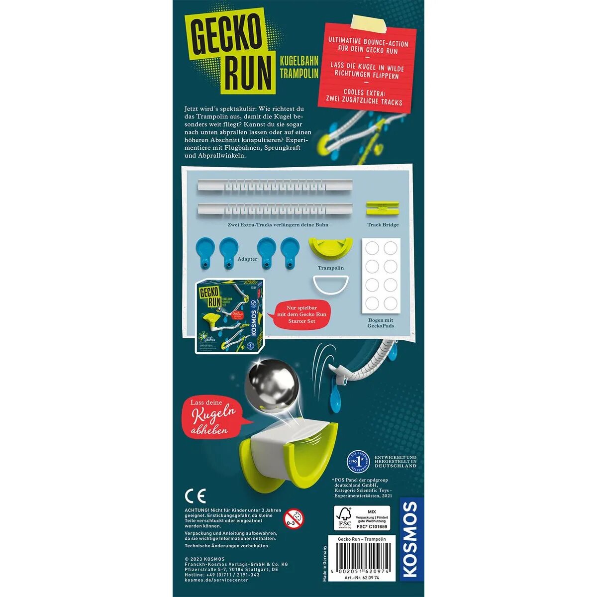 Mit dem Trampolin wird die Bahn um ein spektakuläres Element erweitert: Wie muss ich das Trampolin ausrichten, damit die Kugeln besonders weit oder hoch fliegen? Kann ich die Kugel sogar zurück auf einen höher liegenden Streckenabschnitt katapultieren? Spannende neue Fragen, die die Kinder ab 8 Jahren austüfteln können! Die Anleitung gibt den ersten Kick mit tollen Ideen für die Tricks. Das tolle Extra: Zusätzliche Bahn-Elemente aus vergrößern die Reichweite der KOSMOS Kugelbahn! Hinweis: nur mit dem Gecko Run „Starter Set“ spielbar.