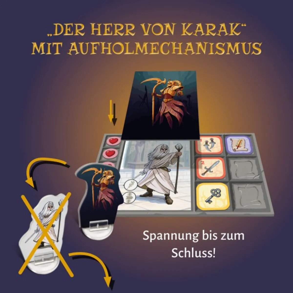 Der einstige Herrscher von Karak ist zurückgekehrt – und fordert seinen Thron. Die Spielerinnen und Spieler müssen ihn stoppen und erneut Schätze sammeln, um zu gewinnen. Also, zückt die Würfel! In dieser Erweiterung sind neben dem Herrscher von Karak vier neue Helden, spannende Kampfarenen und neuartige Gegner enthalten. Der raffinierte Spielmodus lässt einen Mitspieler oder eine Mitspielerin zum mächtigen Herrscher aufsteigen. Mit dem Grundspiel und der abwechslungsreichen Spielerweiterung erleben Kinder ab 7 Jahren jetzt noch mehr Abenteuer in Karak!