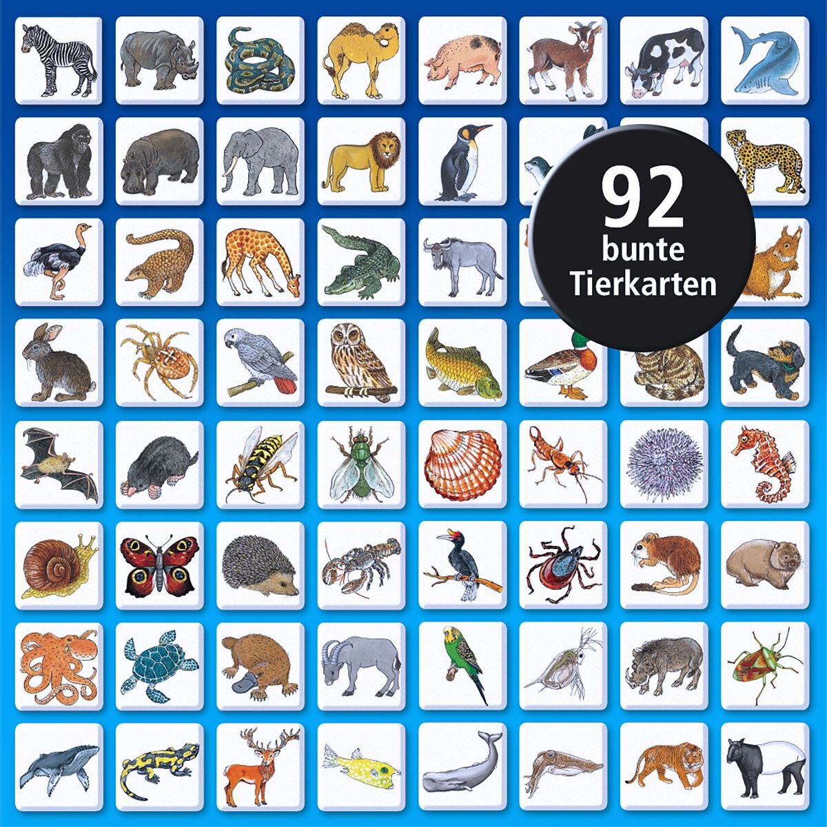 Inhalt: 92 Tier-Kärtchen, 24 Merkmals-Kärtchen, 4 Schweine-Figuren, 1 Schweine-Flugbahn, 16 Spielchips, 1 Lösungsheft mit Spielanleitung