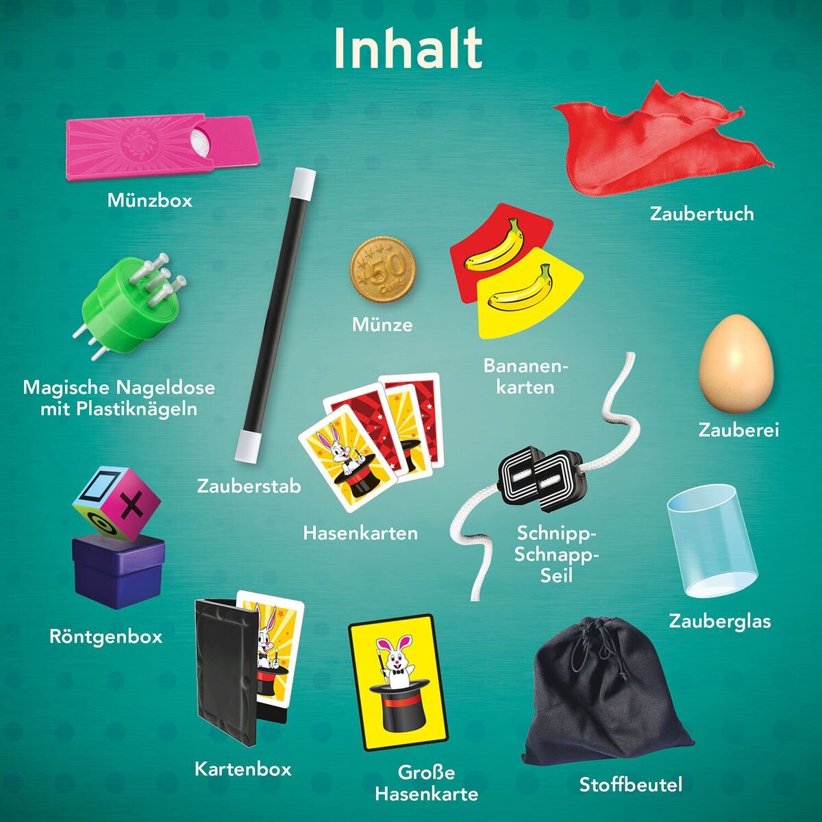 Inhalt: Schnipp-Schnapp-Seil, Große Hasenkarte, Bananenkarte, Zauberstab, Magisches Ei, Tuch, Münzbox, Zaubermünze, Magischer Bescher, Nagelbox, Röntgenbox, Röntgenwürfel, Karten-Box, Magische Karten, Stoffbeutel, farbig illustrierte Anleitung.