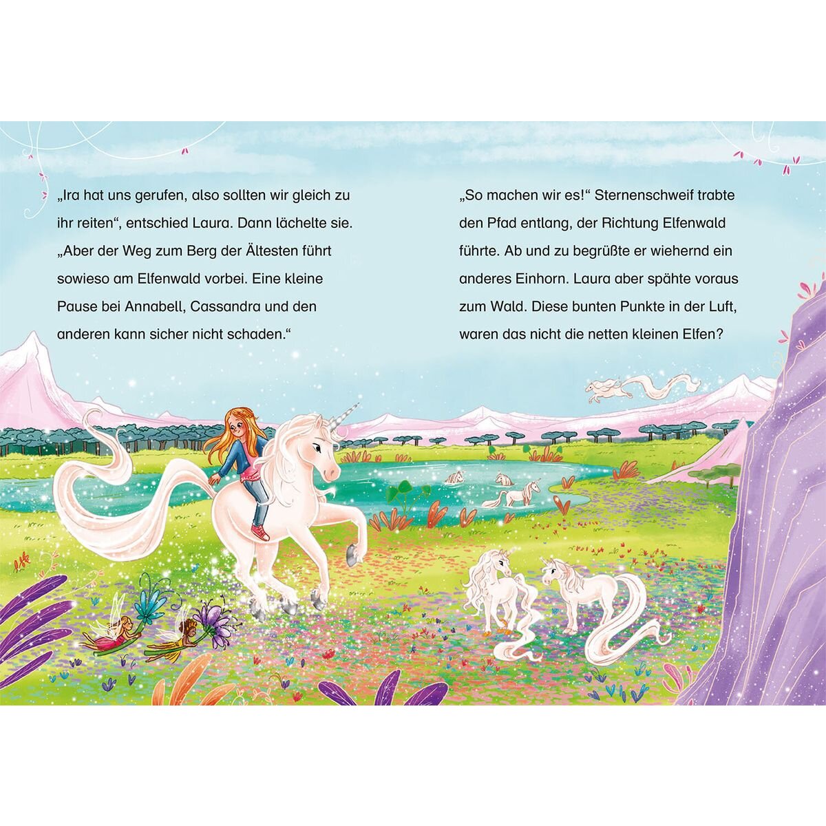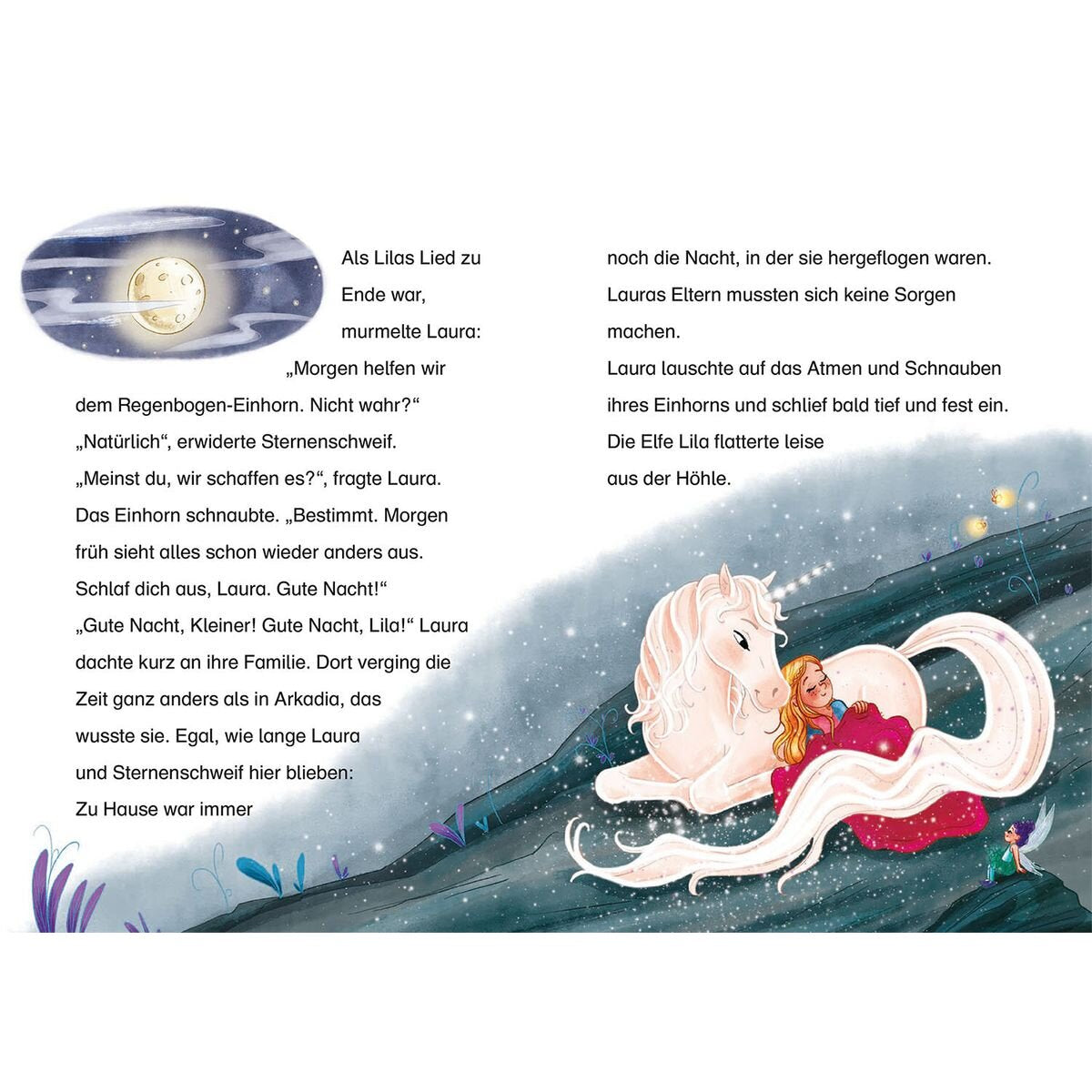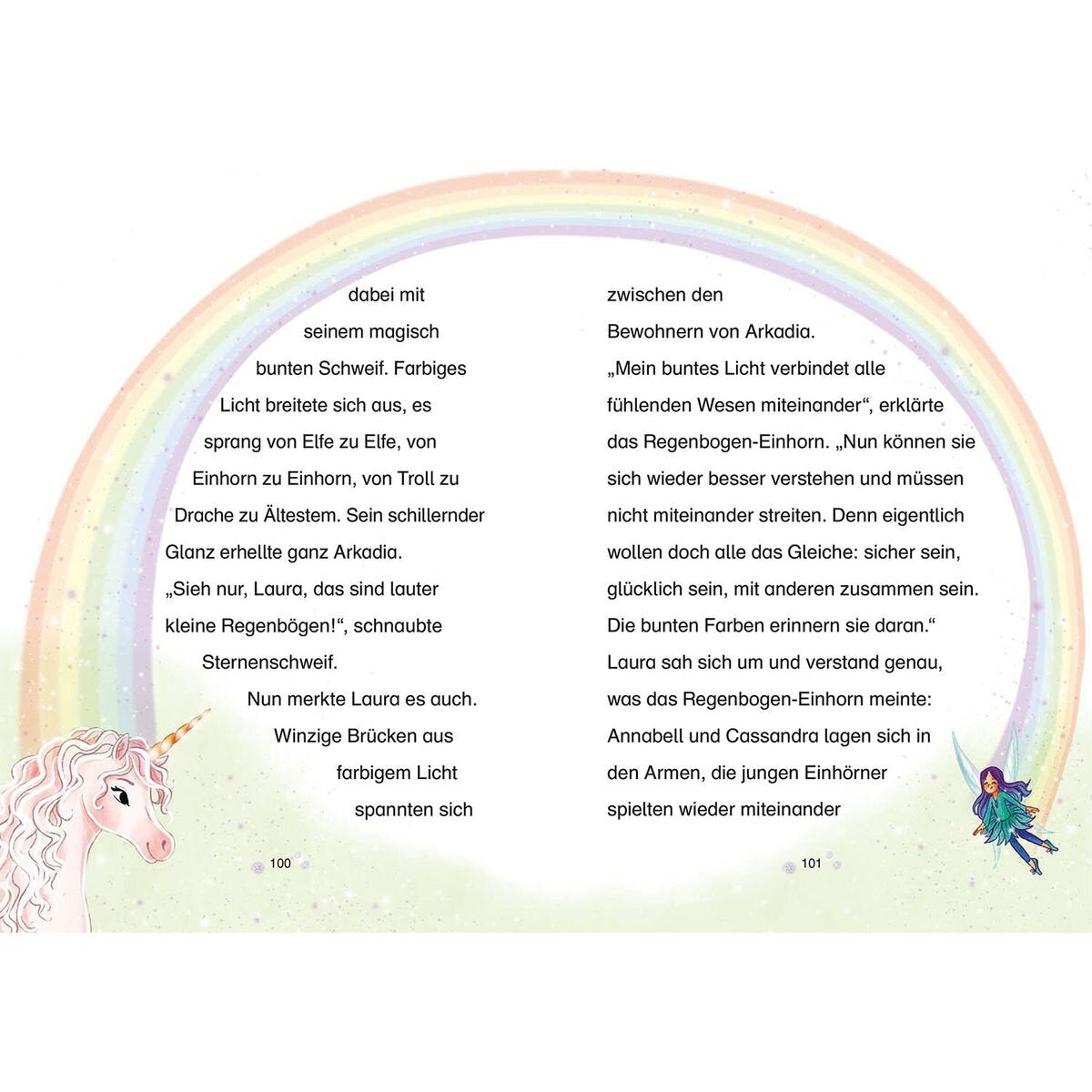 Was ist nur in Arkadia los? Alle Einhörner, Elfen, Trolle und Drachen streiten plötzlich miteinander. Laura und Sternenschweif werden gerufen, um die Wogen zu glätten, doch das ist nicht so leicht. Wenn nur das Regenbogen-Einhorn da wäre, um mit seinem magisch-bunten, zauberschönen Regenbogen die Ungewitterstimmung zu vertreiben! Wird es Laura und Sternenschweif gelingen, das Regenbogen-Einhorn nach Arkadia zurückzuholen?