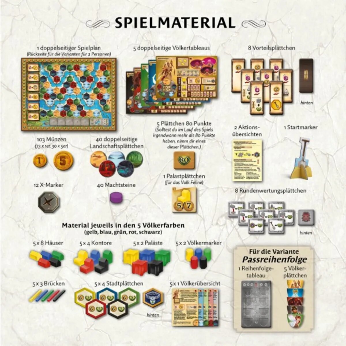 Inhalt: 1 doppelseitiger Spielplan, 5 doppelseitige Völkertableaus, 8 Vorteilsplättchen, 8 Rundenwertungsplättchen, 103 Münzen, 40 doppelseitige Landschaftsplättchen, 40 Machtsteine, 5 Plättchen "80 Punkte", 2 Aktionsübersichten, 1 Startmarker, 10 X-Marker, 1 Palastplättchen für das Volk "Feline", 5x 8 Häuser, 5x 4 Kontore, 5x 2 Paläste, 5x 2 Völkermarker, 5x 3 Brücken, 5x 4 Stadtplättchen, 5x 1 Völkerübersicht, 1 Reihenfolgetableau, 5 Völkerplättchen, 1 Anleitung