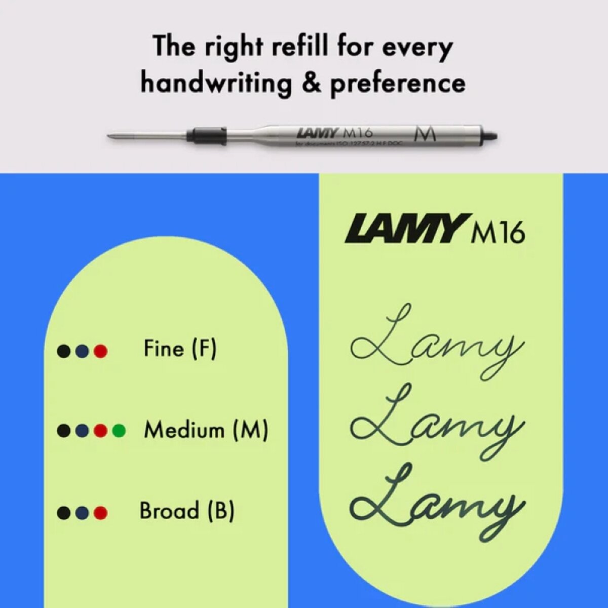 Leichtgewichtiger Kugelschreiber mit ergonomischem Griffstück aus hochwertigem transparentem Kunststoff. Markanter Clip aus Metall und widerstandsfähiges Gehäuse aus eloxiertem Aluminium. Inklusive Großraummine LAMY M 16 in Strichbreite M in schwarz.