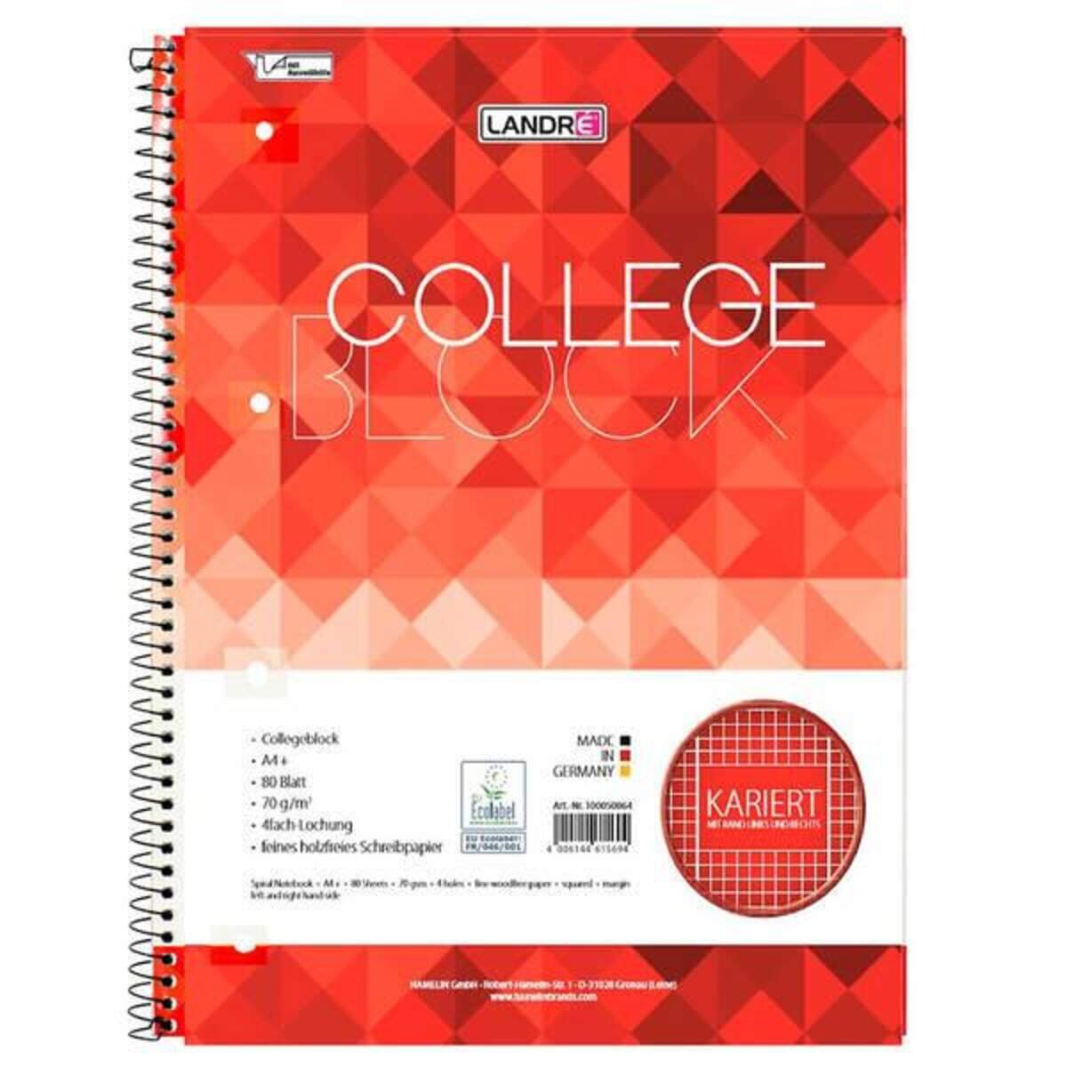 Landré Collegeblock A4 Lineatur38, Kariert, 80 Blatt