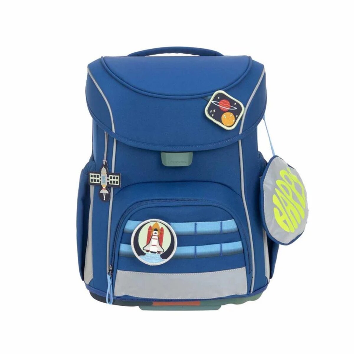 - Set aus Ranzen, Turnbeutel, Federtasche, Schlampermäppchen, Brustbeutel, Regenhülle und Patches