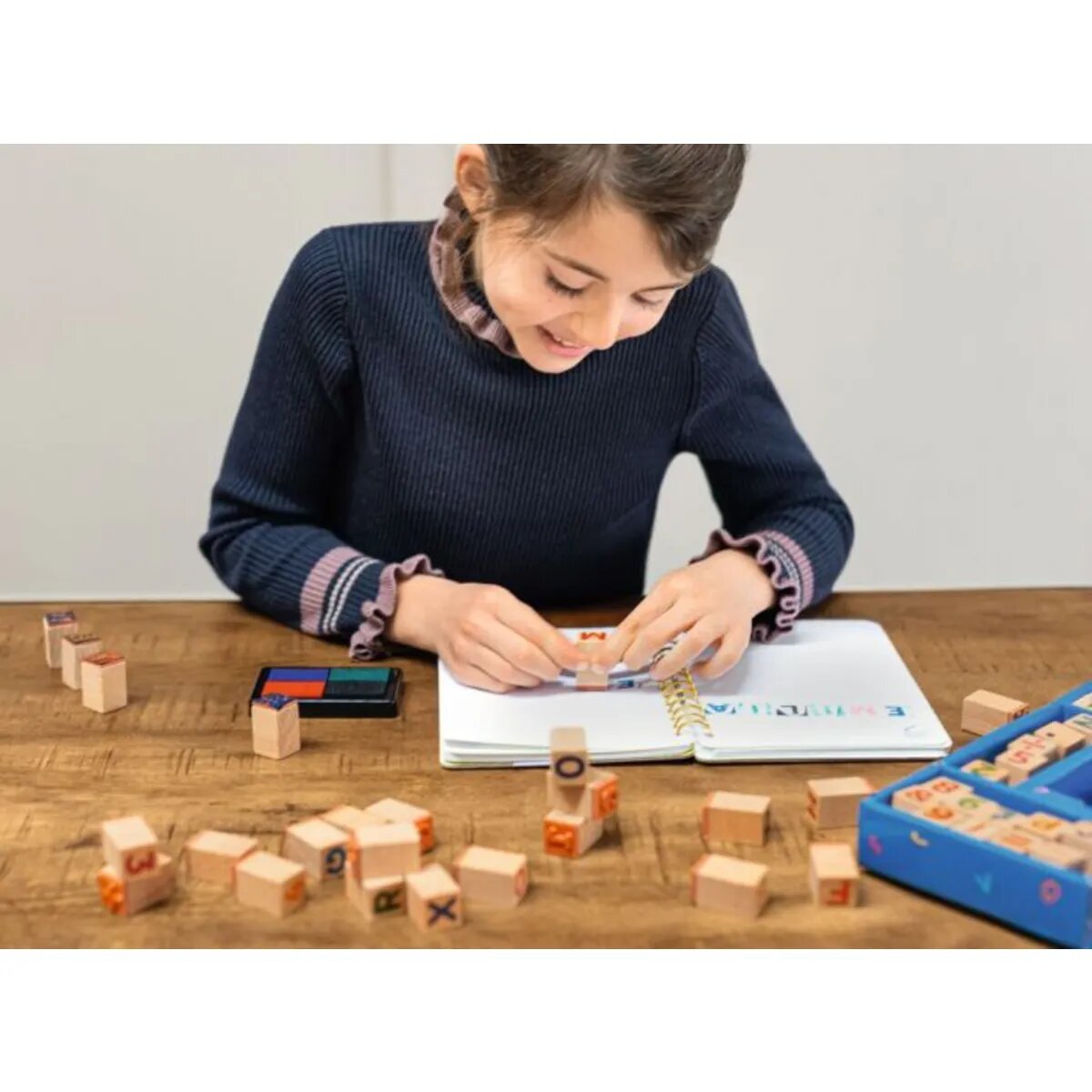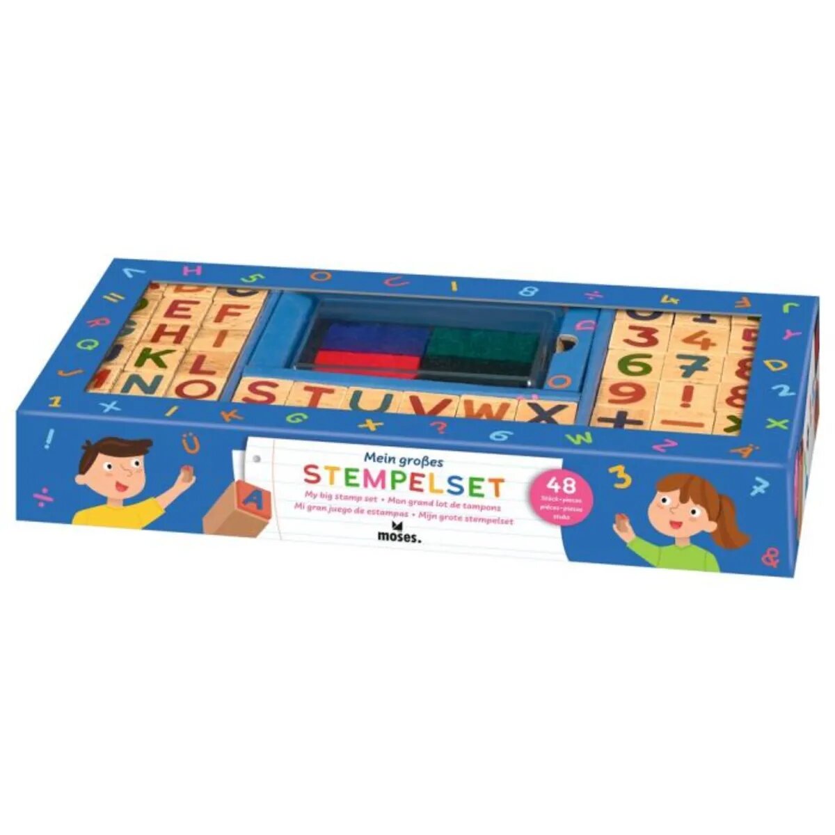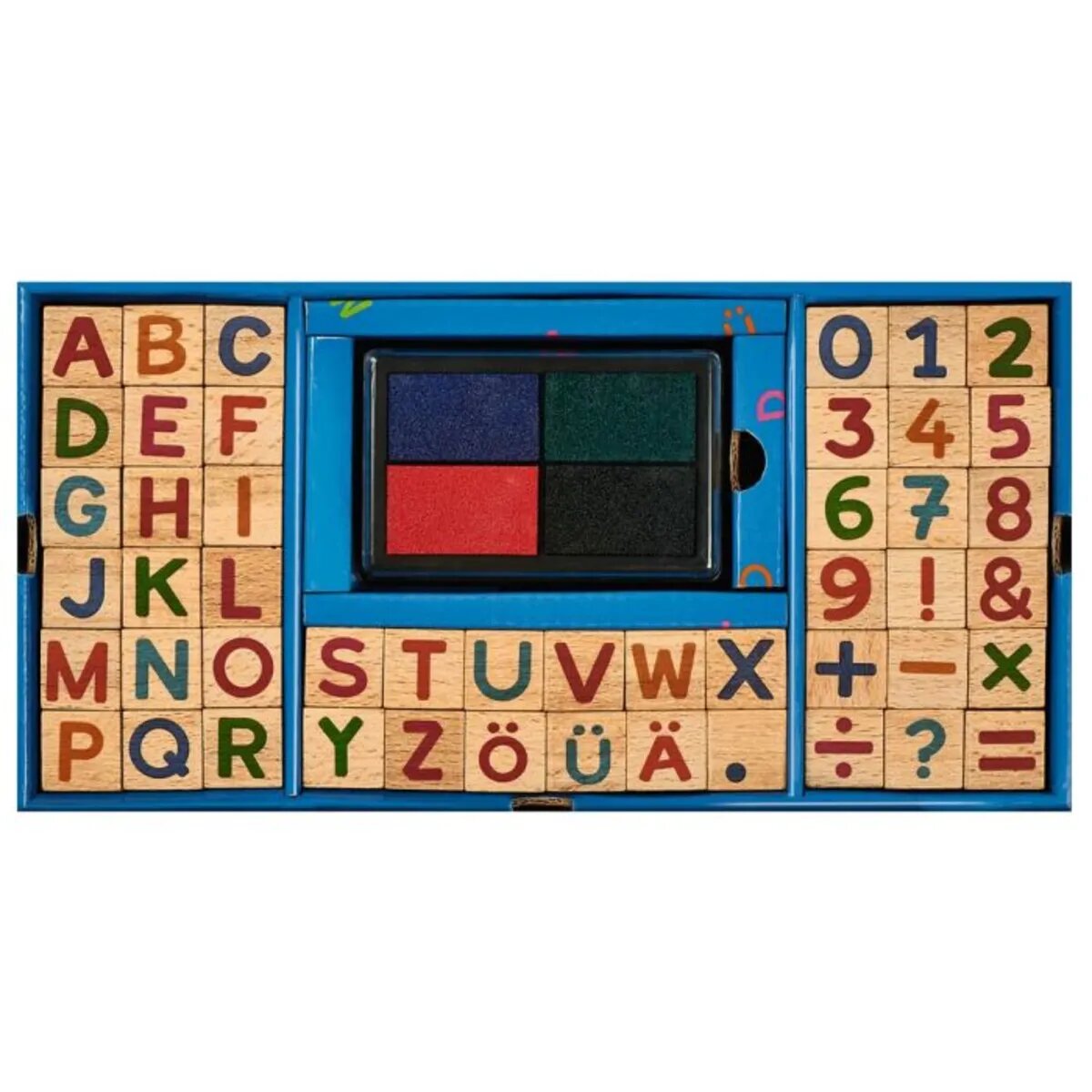 Im Set befinden 48 unterschiedliche Stempel, unter anderem für alle Buchstaben des Alphabets, sowie die Umlaute Ä, Ö und Ü und für Frage- und Ausrufezeichen. Kinder können so ihrer Kreativität freien Lauf lassen und entweder einzelne Wörter, Sätze oder ganze Texte kreieren und gestalten. Ebenfalls im Set enthalten sind Stempel in Form von Zahlen und der Rechenzeichen der vier Grundrechenarten. Dadurch eignet sich das Set nicht nur perfekt für kreative Kunstwerke, sondern auch kleine Rechenübungen.