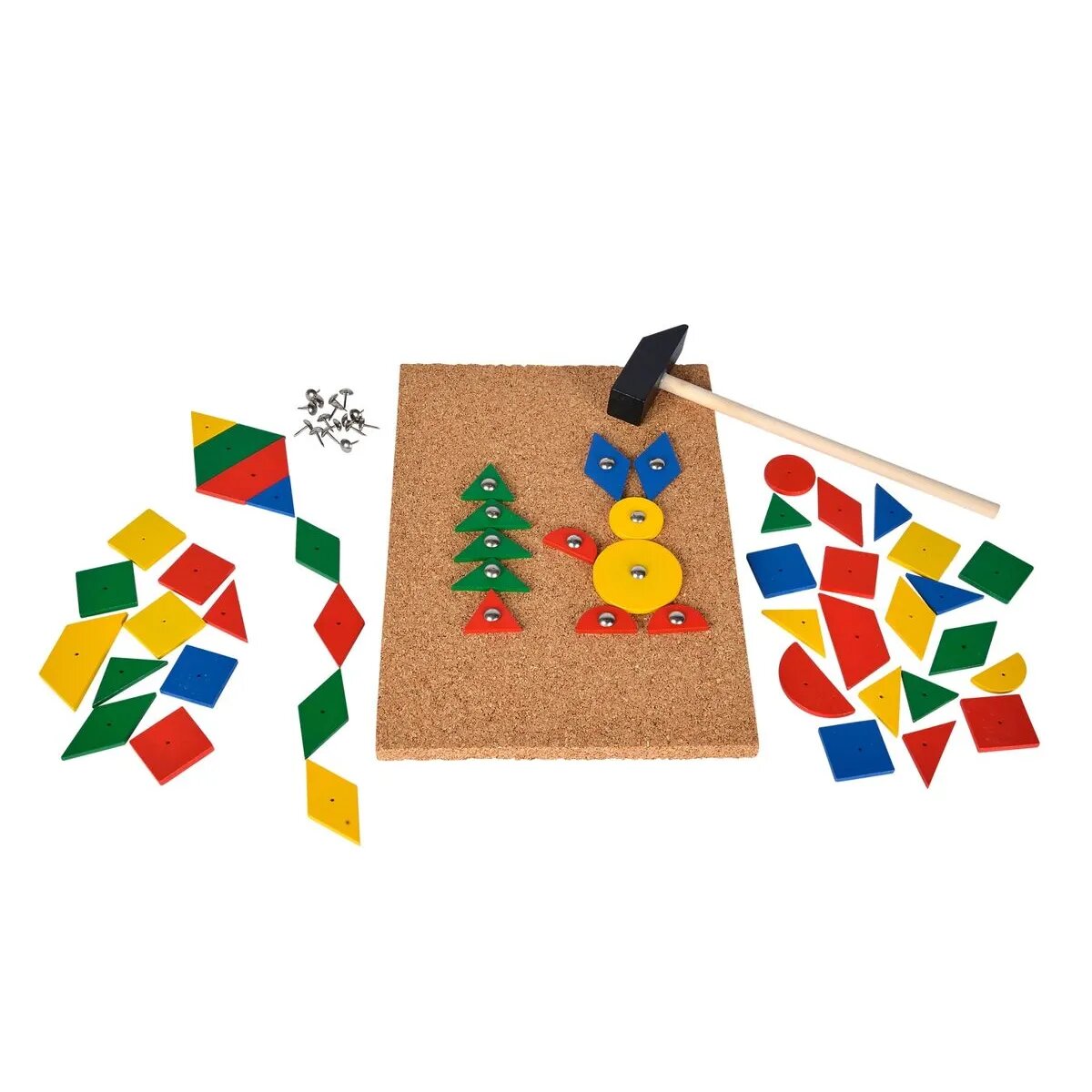 Korkplatte, Hammer, Nägel, bunte Holzteile und schon kann der kleine Hobbyhandwerker loslegen. Das "Hammerspiel" ist ein klassisches Geschicklichkeitsspiel, das die Konzentration und die Feinmotorik schult. Anregungen zum Bauen geben die Vorlagen oder man gestaltet Motive nach eigener Fantasie.