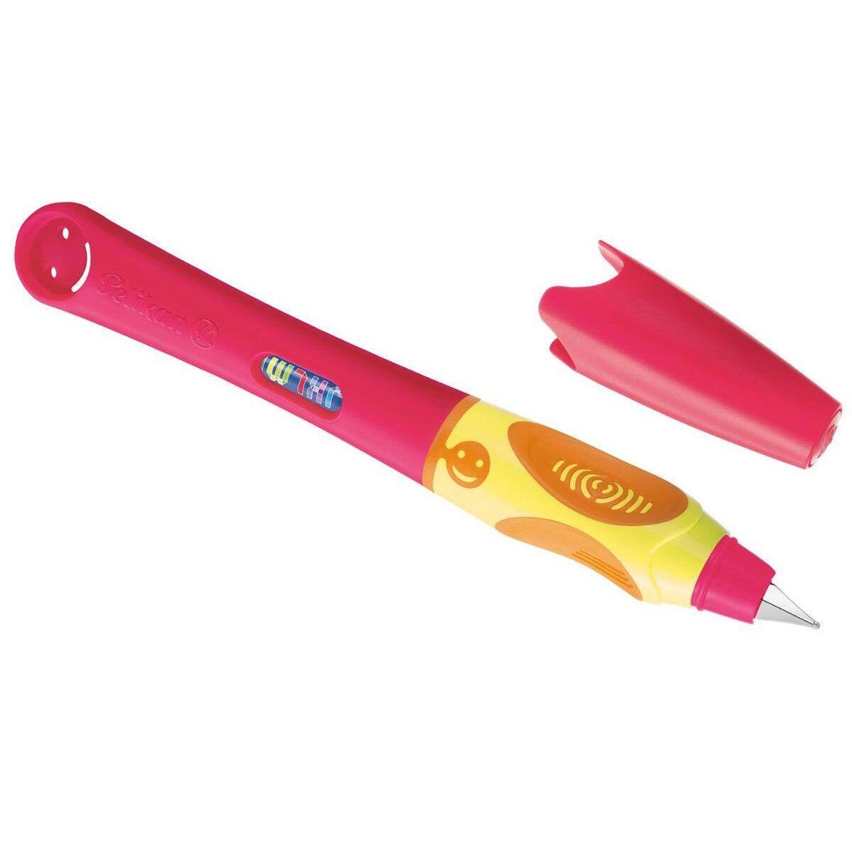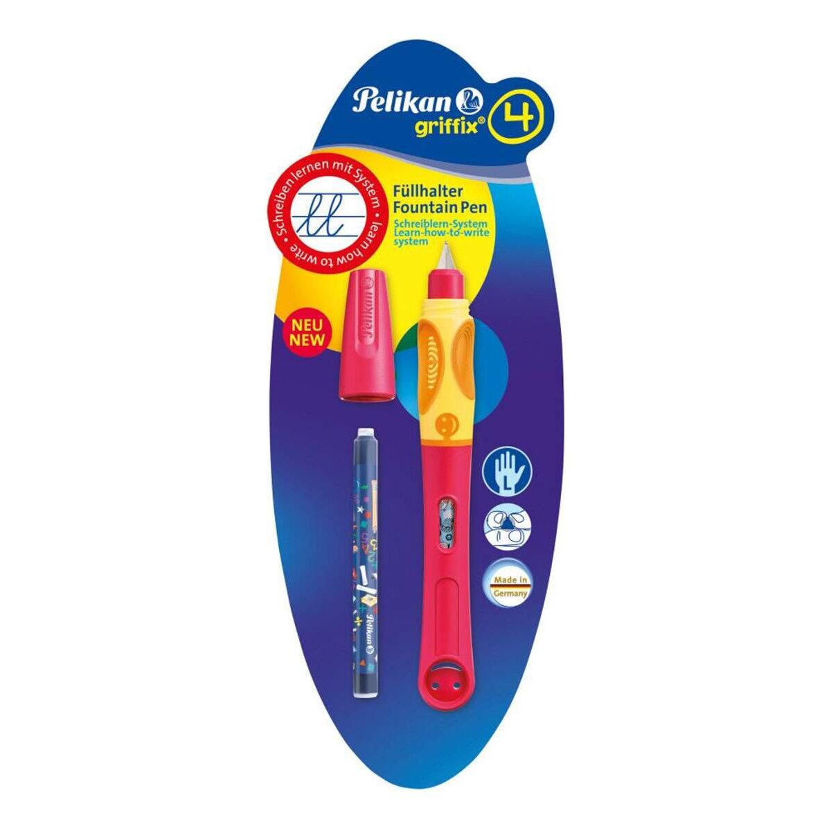Das Pelikan Griffix System Schreiben ist eine motorische Höchstleistung, Schreibenlernen mühevoll und anstrengend. Um den Schreiblernprozess zu unterstützen, hat Pelikan gemeinsam mit Wissenschaftlern und Lehrern das 4-stufige Griffix-Schreiblern-System für Kinderhände entwickelt. Das ergonomische Design der Schreibgeräte fördert die richtige Handhaltung für natürliches und lockeres Schreiben in jeder Lernphase, denn alle Stifte – vom Wachsschreiber über den Bleistift und Tintenschreiber bis hin zum Füller - sind optimal auf die individuelle Lernstufe des Kindes angepasst. Dank des einheitlichen Griffmulden-Konzepts muss das Kind die Handhaltung nicht mehr ändern. Das Gute-Laune Gesicht zeigt, dass der Stift richtig gehalten wird. Das Schreiblern-System gibt es für Rechts- und Linkshänder. Der Griffix Füllhalter (Stufe 4) Der Griffix Füllhalter von Pelikan stellt die höchste Stufe im Schreiblern-Prozess dar. Beim Schreiben mit dem Füller ist es wichtig, dass die entsprechenden Bewegungsabläufe koordiniert und mit Schwung erfolgen. Dann gleitet die Feder leicht über das Papier und Kinder schließen den Schreiblernprozess mit dem Erlernen einer formgerechten und schönen Schrift ab. Der Griffix Füllhalter hat eine robuste Edelstahlfeder, die auch bei ungeübten Füller-Anfängern formstabil bleibt. Damit die Aufmerksamkeit von Zeit zu Zeit auf den Tintenstand gelenkt wird, sind die Patronen für den Griffix Füllhalter mit verschiedenen Motiven versehen. Diese sind durch das Tintensichtfenster erkennbar. Außerdem gibt es den Griffix-Füllhalter in vier tollen Farben. So erhalten Kinder einen Füllhalter, der nicht nur gut schreibt, sondern auch trendig aussieht. Lieferumfang: - Füllhalter - Patrone