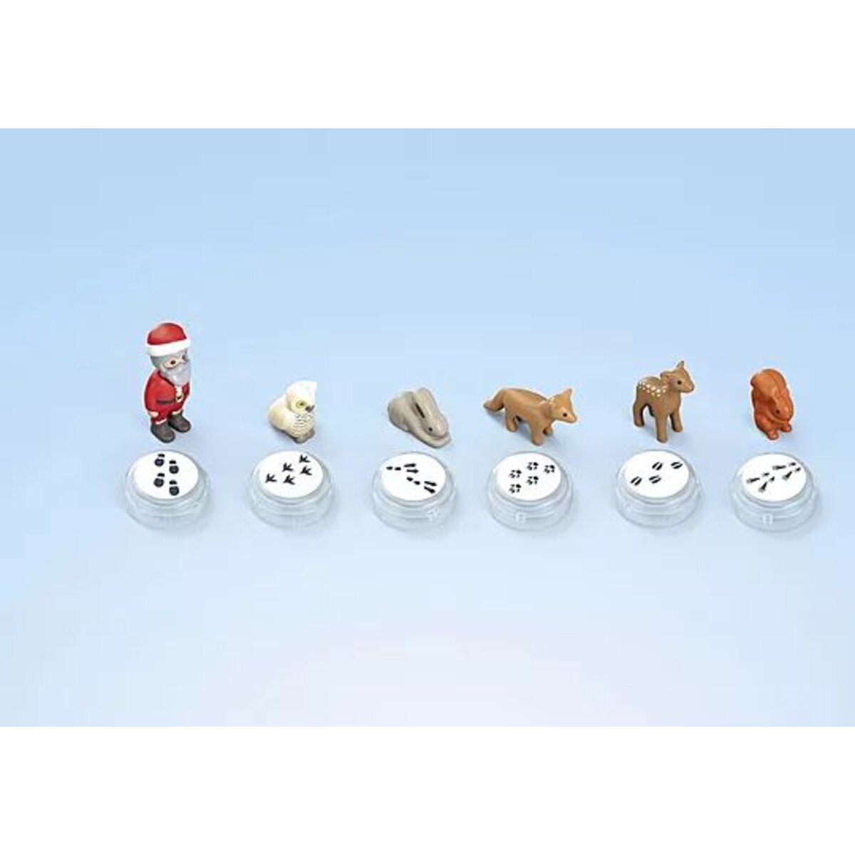 Figuren: 1 Weihnachtsmann, 1 Engel (Frau), 1 Engel (Mädchen) Tiere: 1 Eule, 1 Fuchs, 1 Hase, 1 Reh, 1 Rehkitz, 1 Hirsch, 1 Eichhörnchen, 1 Bache, 1 Frischling Zubehör: 1 Flugzeug, 3 Geschenk-Steckelemente, 1 Tanne, 1 Höhle, 1 Stern, 6 Tierspuren-Stapelsteine