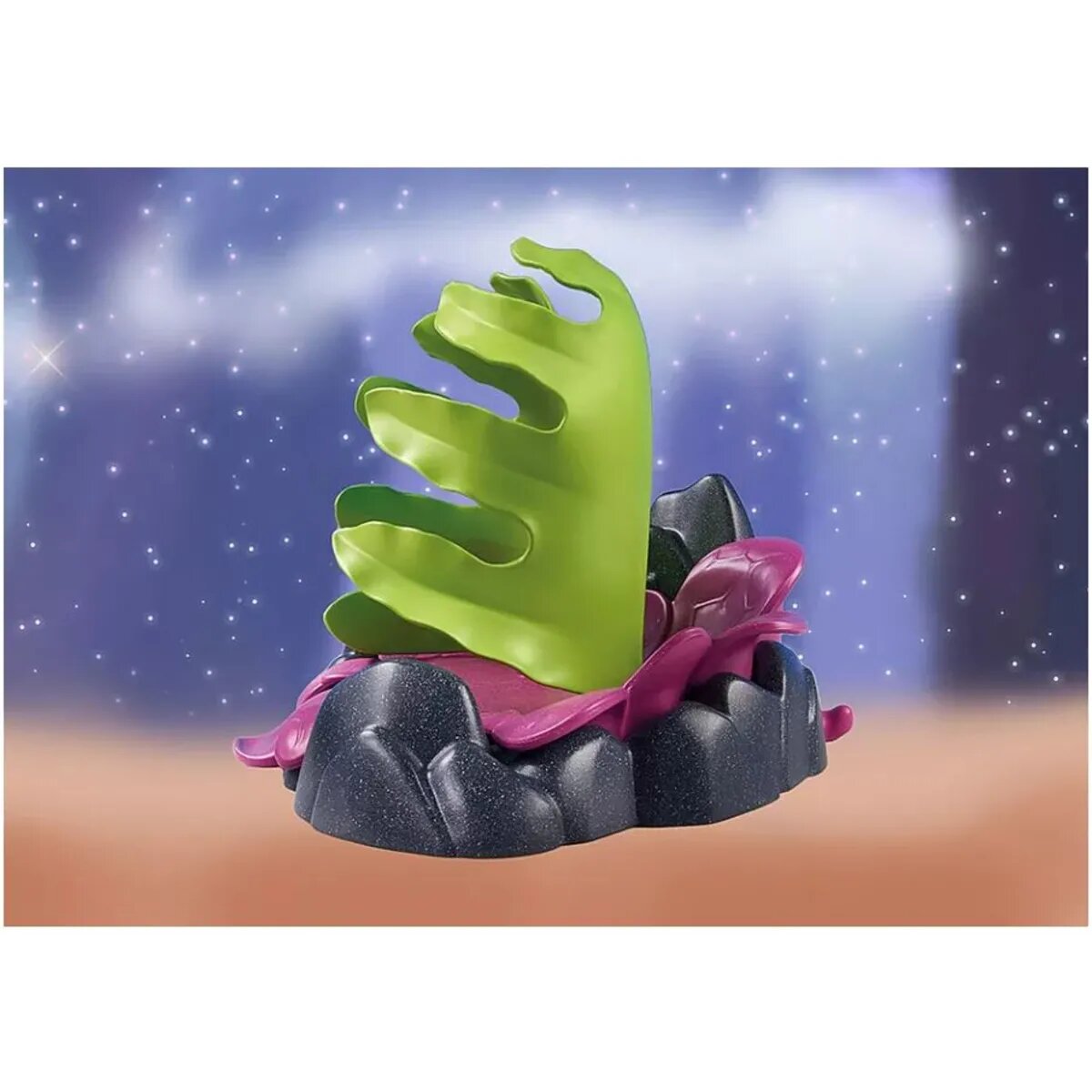 Das 47-teilige Feen-Spielzeug enthält drei PLAYMOBIL-Figuren, zwei Seelentiere Flugechse und Eule, eine Nebelfalle mit beweglichen Blättern, einen Baum mit magischer Blüte und Laterne sowie weitere liebevolle Extras. Moon Fairy Starmia besitzt ein Wechselgesicht. Kopfschmuck, Armringe, Halskette und Silikonrock können abgenommen werden. Die Blütenlaterne leuchtet im Dunkeln nach.