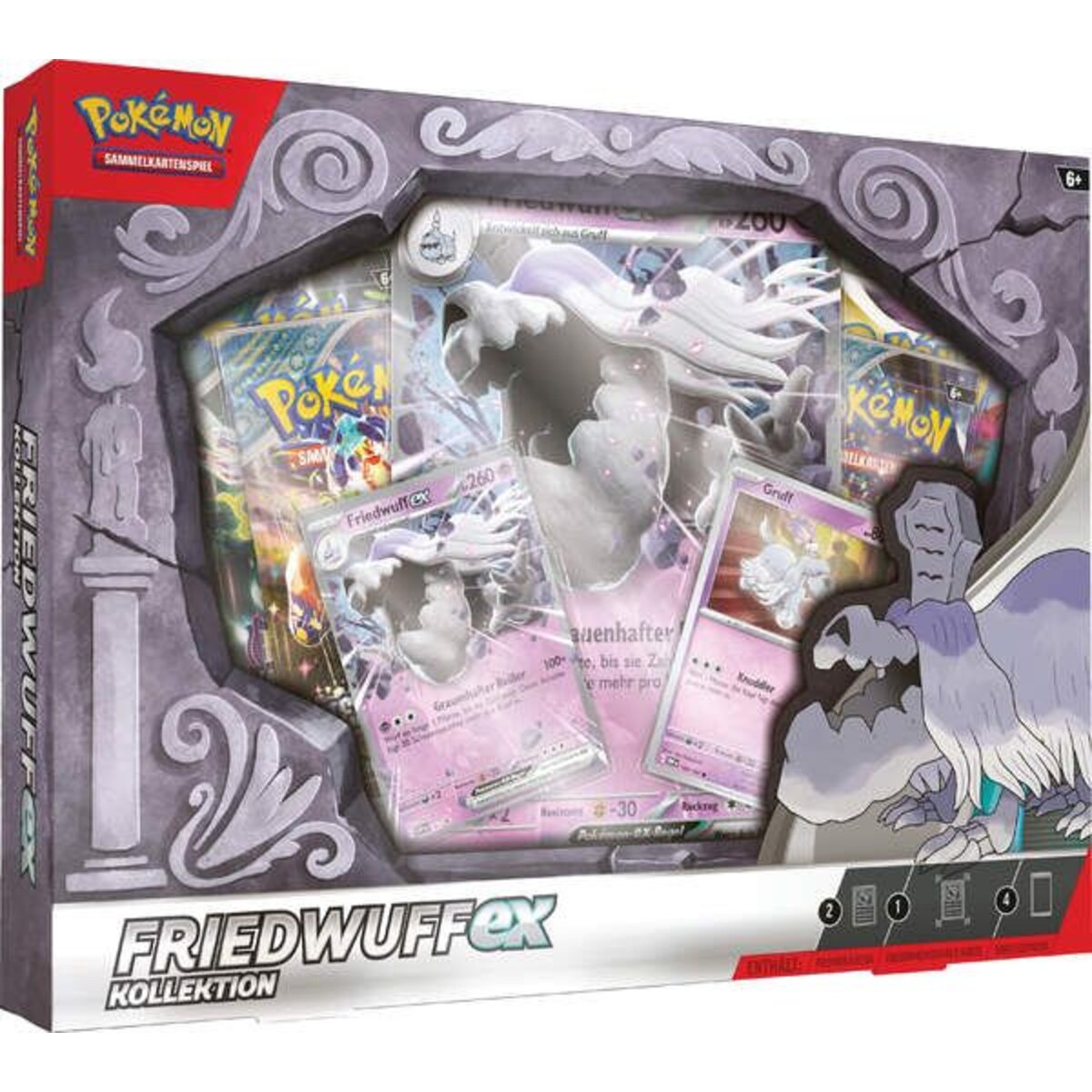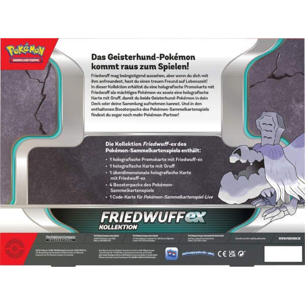 In dieser Kollektion erhältst du eine holografische Promokarte mit Friedwuff als mächtiges Pokémon-ex sowie eine holografische Karte mit Gruff, damit du beide Geisterhund-Pokémon in dein Deck oder deine Sammlung aufnehmen kannst. Und in den enthaltenen Boosterpacks des Pokémon-Sammelkartenspiels findest du sogar noch mehr Pokémon-Partner!