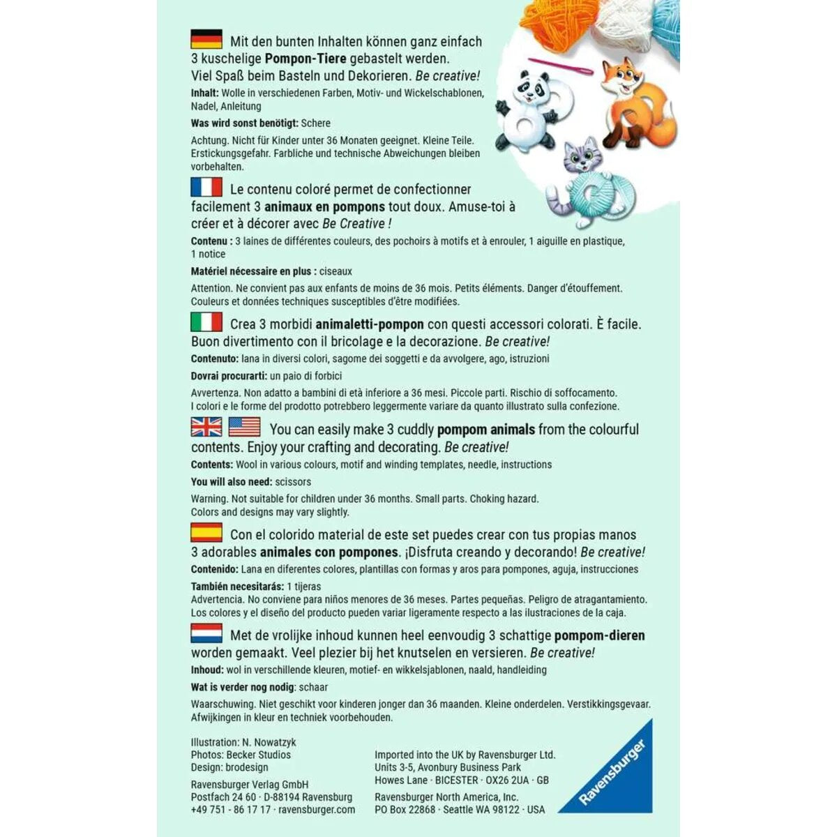 Mit dem Ravensburger Be Creative Set Pompon-Tiere können Kinder ab 6 Jahren aus der im Kreativset enthaltenen Wolle und den Wickelschablonen kugelrunde und kuschelige Tiere basteln. Das Set enthält alle Materialien die für 3 Pompon-Tiere benötigt werden. Einfach Wolle um die bunten Pappschablonen wickeln und aufschneiden - schon kann mit den lustigen Tierchen gespielt werden. Neben der Kreativität und Fingerfertigkeit wird auch die Fantasie der Kinder gefördert. Die Be Creative-Sets von Ravensburger inspirieren Kinder zum Selbermachen! Mit dem Pompon-Set entstehen lustige, kugelrunde Tierchen. Im Set enthalten sind Schablonen für einen Fuchs, eine Katze und einen Panda und auch die dazugehörige Wolle liegt bei. Die fertigen Tierchen können von Jungen und Mädchen ab 6 Jahren zum gemeinsamen Spielen oder zur Dekoration des Kinderzimmers verwendet werden. Die BeCreative-Reihe wird durch weitere Sets zum Thema DIY und kreativen Grundtechniken abgerundet.