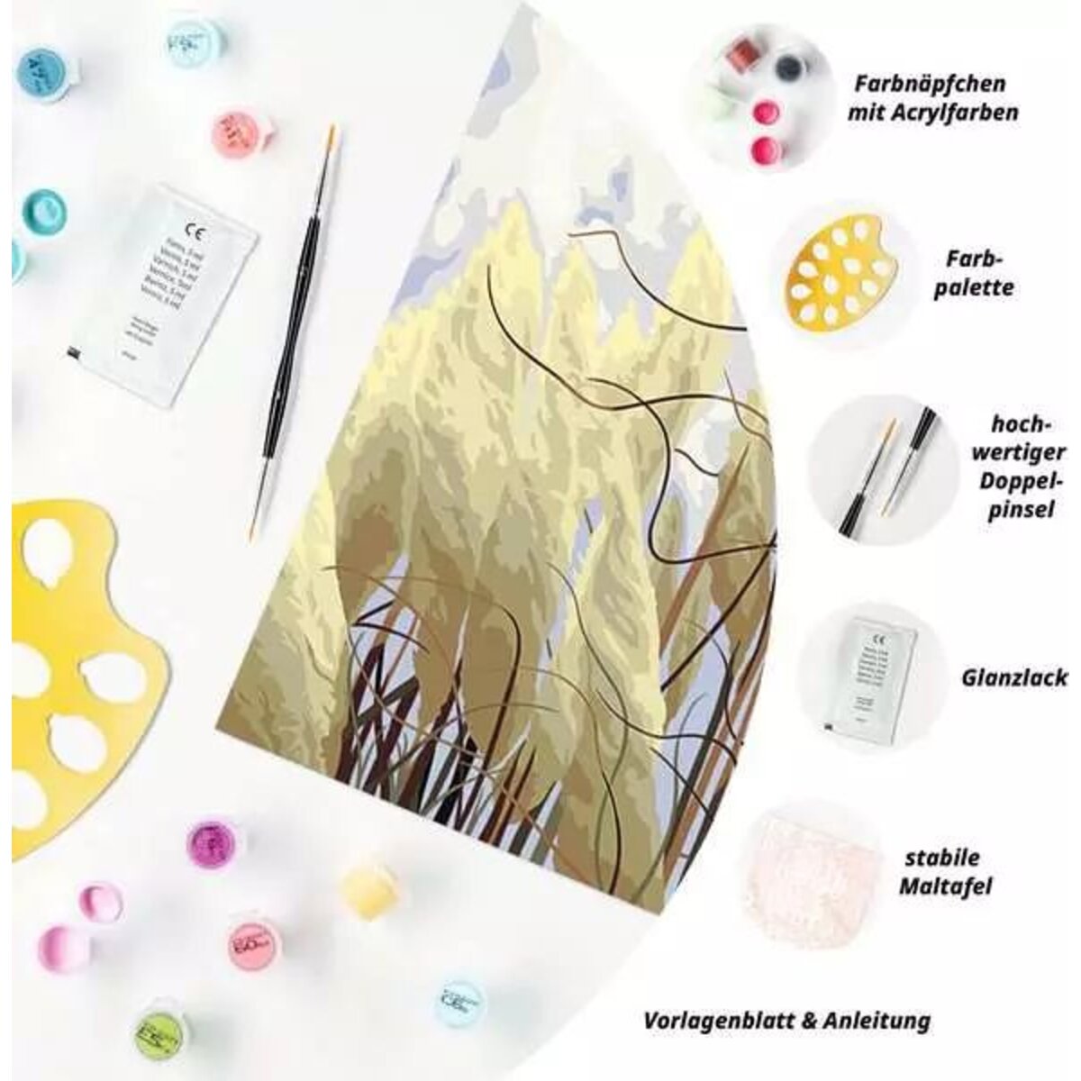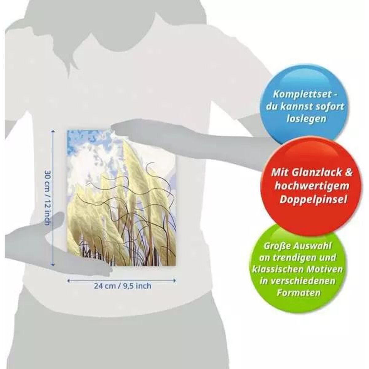 Coole Motive, leuchtende Farben und glänzender Lack für ein perfektes Finish. Das trendige Motiv Grass in the Wind sorgt für großartigen Malspaß für Erwachsene ab 12 Jahren. Die Motivlinien sind bereits aufgedruckt und nummeriert und werden mit den fertig gemischten Acrylfarben ausgemalt. Das ist Malspaß mit Erfolgsgarantie für einen einzigartigen Wandschmuck. So einfach war malen noch nie!