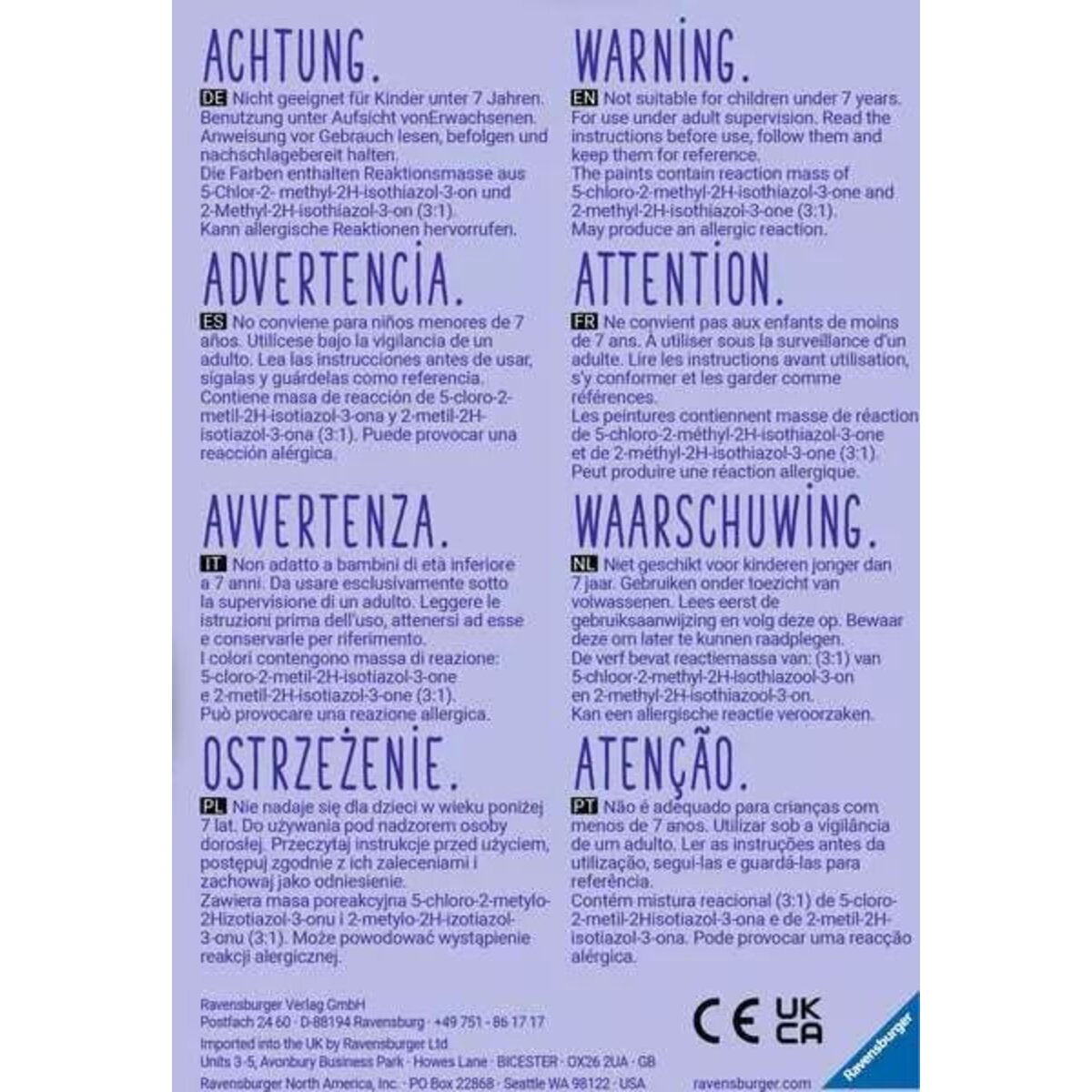 Nicht geeignet für Kinder unter 7 Jahren. Benutzung unter Aufsicht von Erwachsenen. Anweisung vor Gebrauch lesen, befolgen und nachschlagebereit halten. Die Farben enthalten Reaktionsmasse aus 5-Chlor-2- methyl-2H-isothiazol-3-on und 2-Methyl-2H-isothiazol-3-on (3:1) Kann allergische Reaktionen hervorrufen.