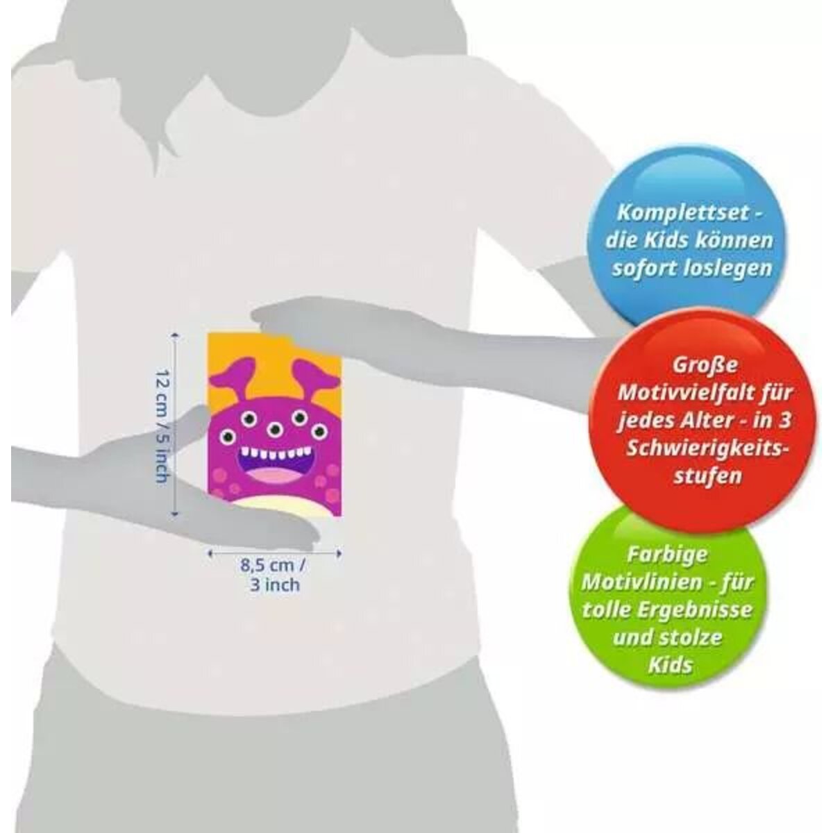 Dank der farbigen Motivlinien, können die Kinder das ganze Motiv Lila Monster und die Farben schneller erkennen. Der Pinsel hat eine gute Führung und so entsteht nach und nach ein perfektes Bild.
