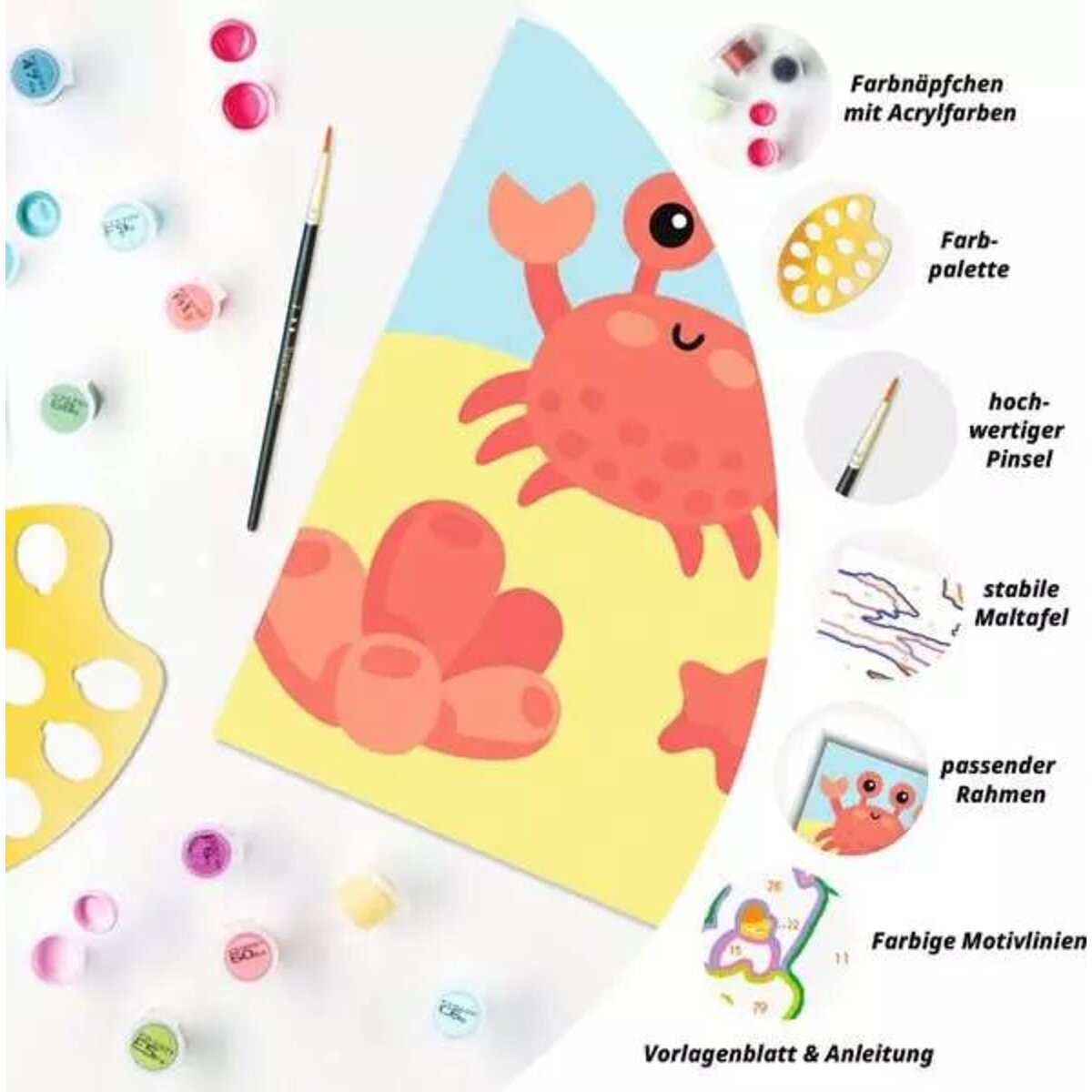 Dank der farbigen Motivlinien, können die Kinder das ganze Motiv Fröhliche Krabbe und die Farben schneller erkennen. Der Pinsel hat eine gute Führung und so entsteht ein perfektes Bild.