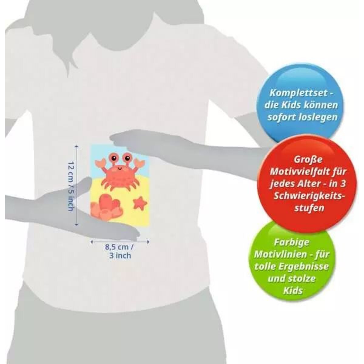 Die Motive sind altersgerecht in drei Schwierigkeitsstufen umgesetzt: von einfachen Bildern mit wenigen, großen Malflächen bis hin zu Bildern mit vielen, kleinen Malflächen für Fortgeschrittene.