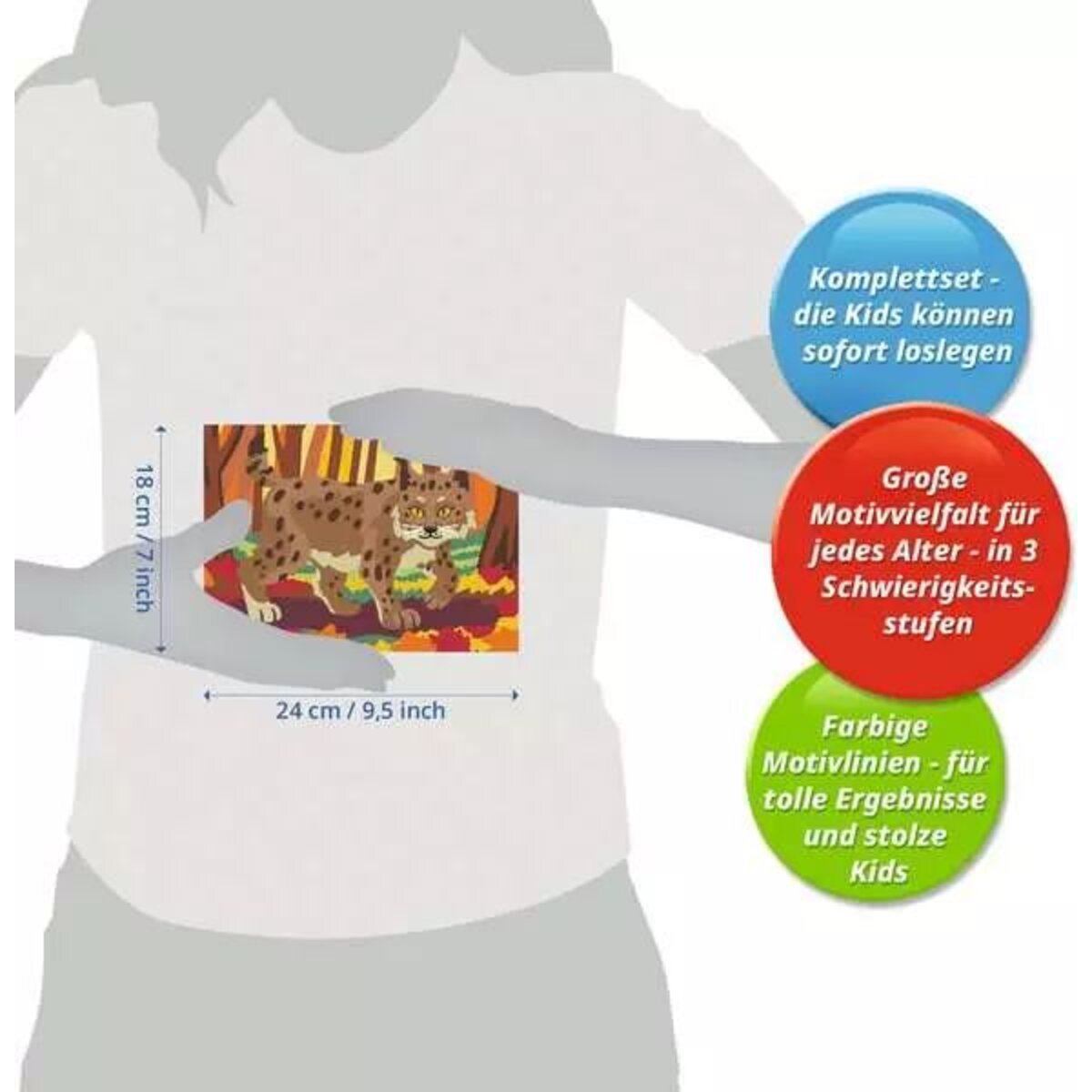 Die Motive sind altersgerecht in drei Schwierigkeitsstufen umgesetzt: von einfachen Bildern mit wenigen, großen Malflächen bis hin zu Bildern mit vielen, kleinen Malflächen für Fortgeschrittene.