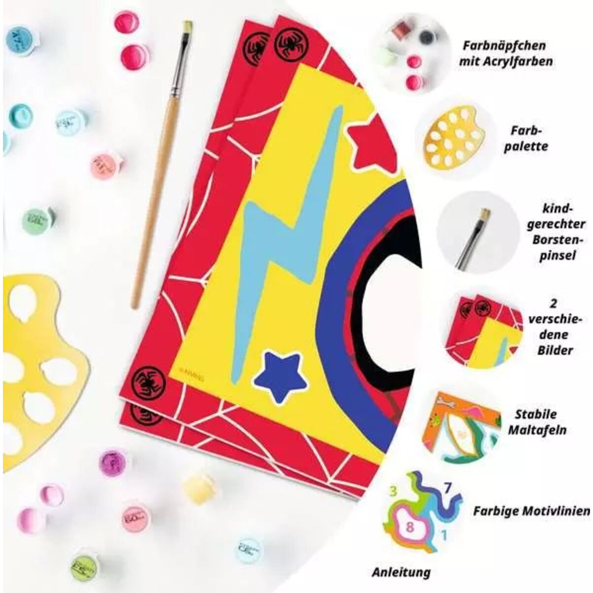 Dank der farbigen Motivlinien, die die Malfelder umranden, können die Kinder das ganze Motiv und die Farben schneller erkennen. Das farbenfrohe Motiv Spidey ist eine tolle Geschenkidee für Kinder von 5-7 Jahren und eine schöne Dekoration für das Kinderzimmer. In diesem Malset sind 5 fertig gemischte Acrylfarben und ein Pinsel enthalten.
