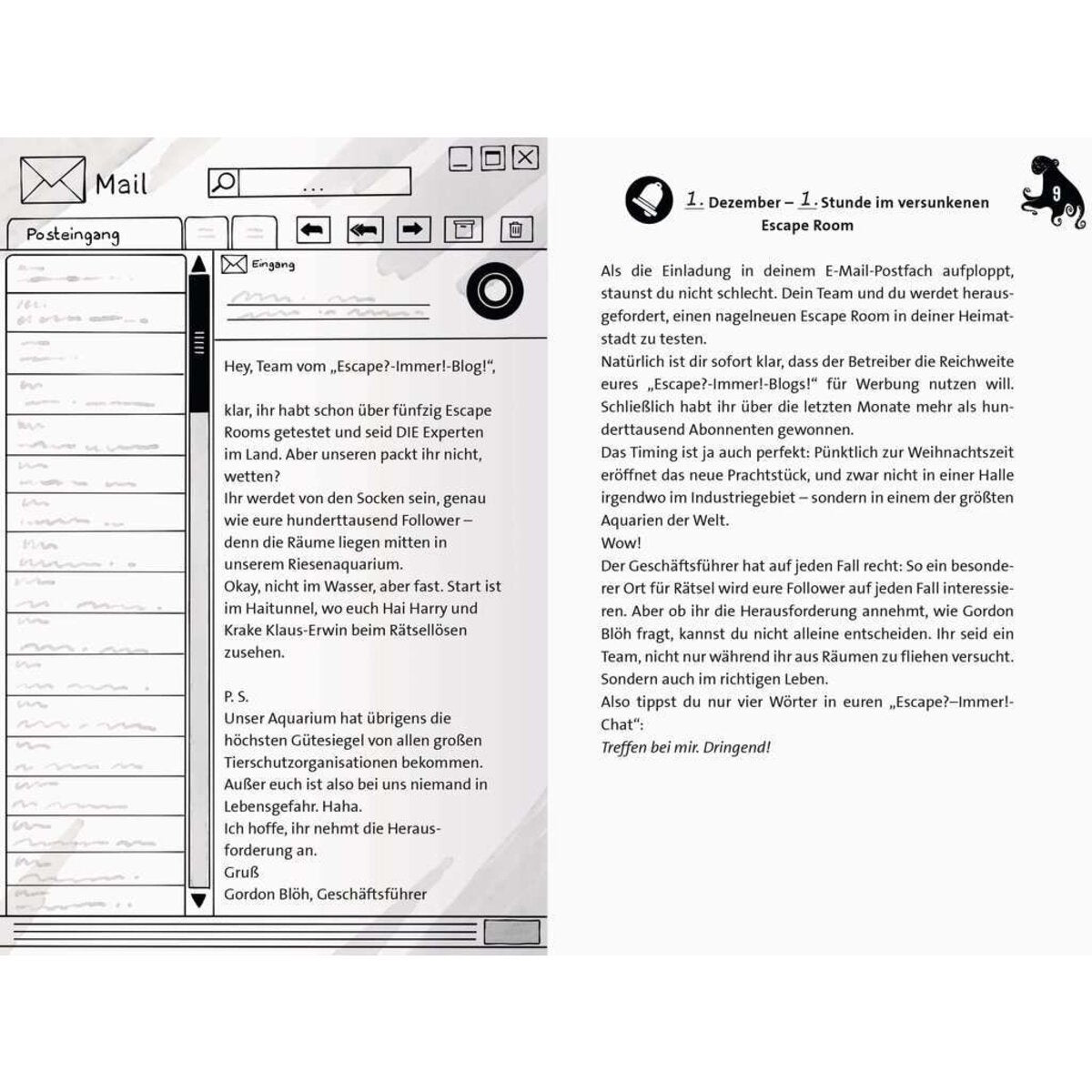 Das Adventskalender-Abenteuer mit 1000 Gefahren in einem Escape Room unter Wasser!Du kannst es kaum erwarten, den neuen Escape Room mitten in einem riesigen Aquarium zu testen. Noch glaubst du, dass es für einen Experten wie dich und deine Freunde ein Kinderspiel wird. Doch kaum ist die Tür hinter euch zugefallen, verkündet eine eisige Stimme: Wenn ihr es nicht schafft, rechtzeitig alle Rätsel zu lösen, endet ihr als Haifischfutter. Jetzt müsst ihr euch beeilen, denn die Glaswände um euch herum knirschen und es zeigen sich die ersten Risse …Ein Adventskalender voller Gefahren, Rätseln und einer einzigartigen Escape-Room-Welt unter Wasser. Mit auftrennbaren Seiten für Jungen und Mädchen ab 10 Jahren.
