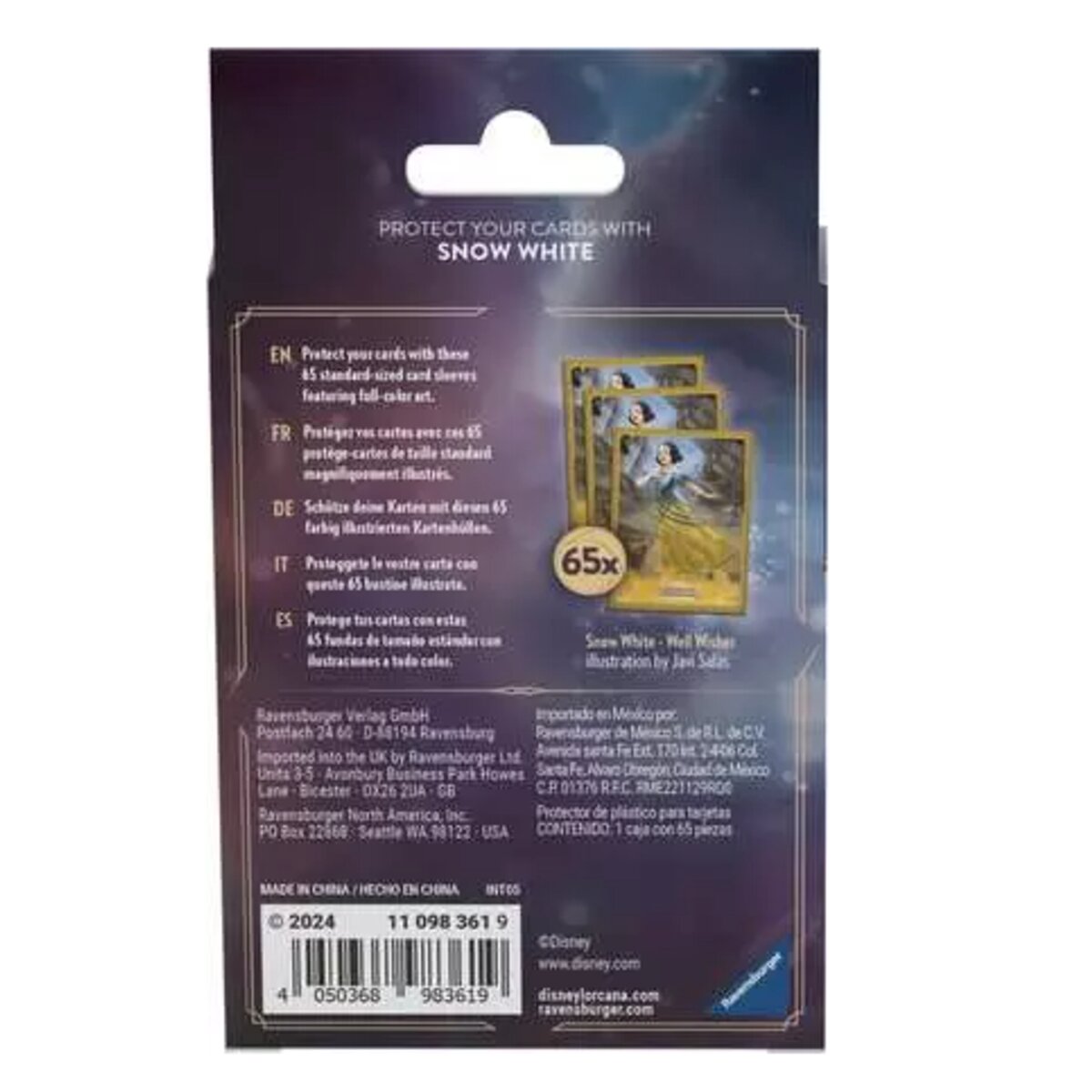 Disney Lorcana TCG Kartenhüllen mit Motiven aus der Welt von Lorcana. Die Kartenhüllen schützen die Karten vor Abnutzung. Jede Packung enthält 65 Kartenhüllen.