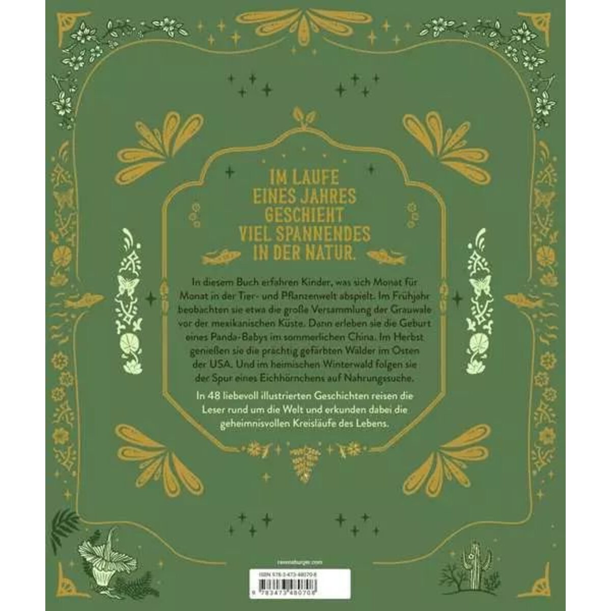 Dieses liebevoll illustrierte Buch lädt Kinder dazu ein, die vier Jahreszeiten und ihre Auswirkungen auf die Natur zu entdecken. Monat für Monat werden sie an besonders spannende Orte rund um den Globus geführt, um zu erleben, wie sich dort Tiere-, Pflanzen und Lebensräume verändern. Wenn die Schneeleopardin im Januar auf Partnersuche geht, im April die Hasenglöckchen in den Wäldern Großbritanniens erblühen, die Leuchtkäfer in den Great Smoky Mountains in den USA die Juninacht erhellen oder oder die Einsiedlerkrebse im September ihre Häuser am Strand Jamaikas tauschen sind die Leser dank der farbenfrohen Zeichnungen ganz nah dabei. 48 mit Sachwissen angereicherte Geschichte bringen ihnen die Zusammenhänge und Kreisläufe in der Natur nahe und wecken in den Kindern ein Bewusstsein für die Geheimnisse, Sehenswürdigkeiten und Schätze, die unsere Umwelt zu bieten hat.